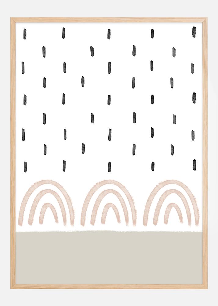 Questo poster artistico, "Rain on Rainbows", combina giocosità e minimalismo in modo unico. Il motivo presenta uno sfondo con arcobaleni ad acquerello in tenui sfumature di terracotta su una base bianca pulita. Sopra questi dolci archi si nota una raccolta di pennellate astratte che assomigliano alla pioggia, che fluttuano in una simmetria disordinata. I colori degli arcobaleni contrastano magnificamente con le "gocce di pioggia" nere come la china, creando un'immagine dinamica ma allo stesso tempo armoniosa.