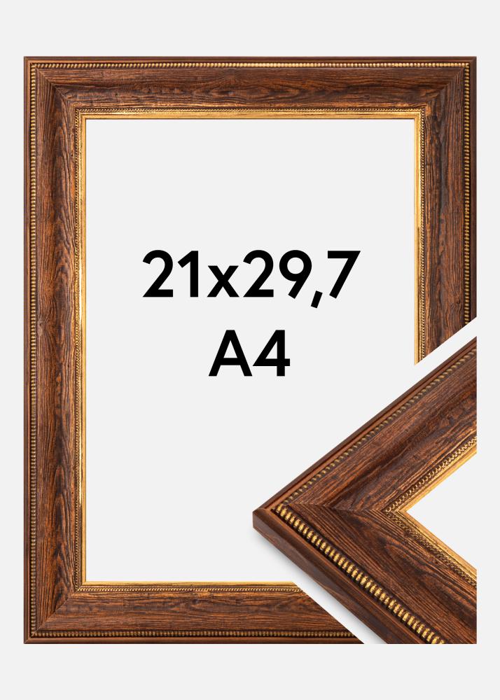 Questa elegante cornice per foto delle dimensioni di 21x29,7 cm è una perfetta combinazione di fascino rustico ed eleganza classica. Realizzata in legno di alta qualità, la cornice ha un colore marrone scuro con dettagli decorativi dorati lungo il bordo interno. La struttura del legno è chiaramente visibile e conferisce una sensazione calda e naturale, mentre gli inserti dorati aggiungono un tocco sofisticato che si adatta perfettamente agli arredamenti tradizionali e ispirati al vintage.