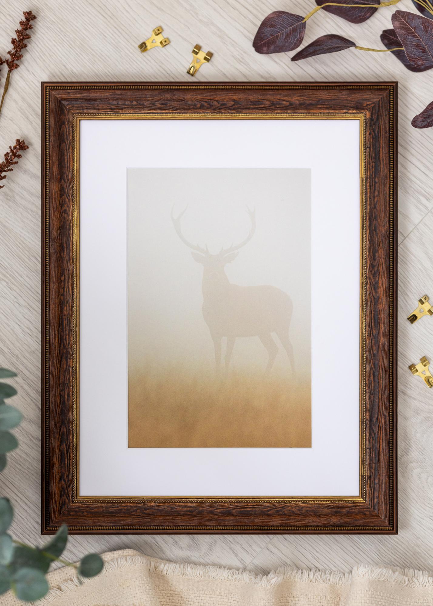 Questa elegante cornice per foto nelle dimensioni 70x100 cm è una perfetta combinazione di fascino rustico e eleganza classica. Realizzata in legno di alta qualità, la cornice ha un colore marrone profondo con dettagli dorati decorativi lungo il bordo interno. La struttura del legno è chiaramente visibile e dona una sensazione calda e naturale, mentre gli inserti dorati aggiungono un tocco sofisticato che si adatta perfettamente agli arredi tradizionali e ispirati al vintage.
