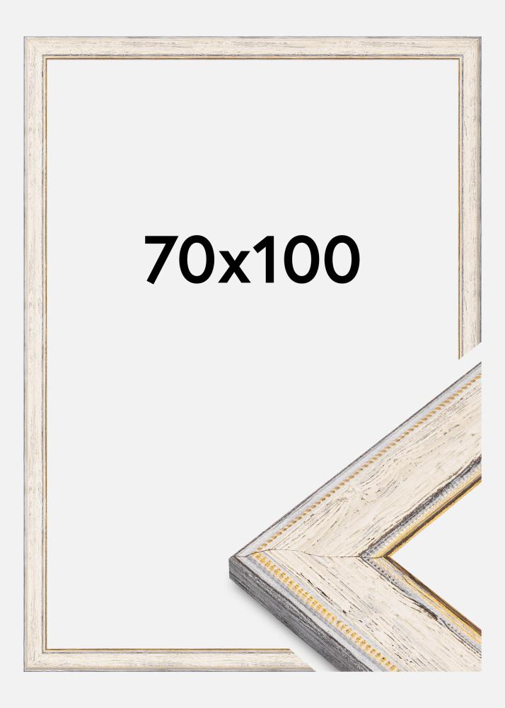 Questa splendida cornice per foto è una perfetta combinazione di ispirazione vintage ed eleganza moderna. Con la sua finitura in legno bianco e grigio rustico, completata da sottili dettagli dorati lungo il bordo interno, offre un aspetto piacevolmente invecchiato. La cornice è progettata per adattarsi a immagini di dimensioni 70x100 cm, rendendola ideale per mettere in risalto le tue fotografie preferite o opere d'arte con un senso di atemporalità e sofisticatezza.