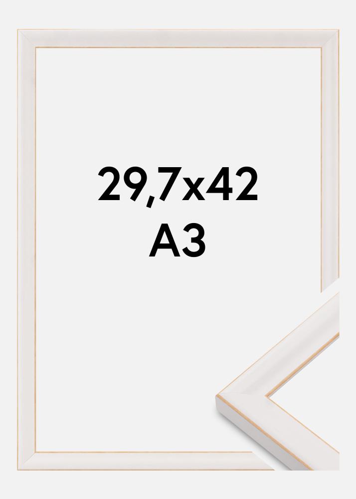 La cornice è realizzata in legno e ha un bordo largo 20 mm e una profondità di 16 mm. Il raffinato dettaglio dorato lungo il bordo interno incornicia l'immagine con una sensazione esclusiva. Con le sue dimensioni di 29,7 x 42 cm, è perfetta per soggetti in formato A3. Questa cornice per foto è dotata di ganci in metallo sul retro, il che la rende facile da appendere sia orizzontalmente che verticalmente a seconda delle tue esigenze.