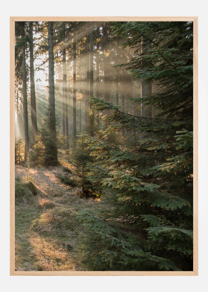 Un incantevole ritratto della foresta. Mentre il tramonto illumina le foglie, il terreno è circondato da alberi più piccoli. Questo paesaggio suggestivo crea un'atmosfera piacevolmente calda e un ambiente rilassante e rinfrescante. Poster perfetto per un soggiorno verde.