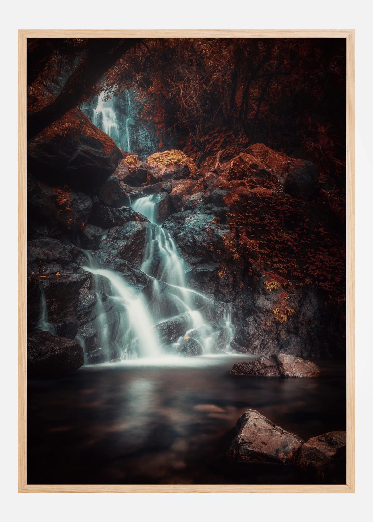 Un poster fantastico con una cascata magica tra il muschio rosso e gli alberi rossi. Il carattere scuro dell'immagine contribuisce a creare un'atmosfera magica con la cascata bianca luminosa al centro dell'attenzione. Viaggia nel tuo giardino dell'Eden personale con questa immagine.