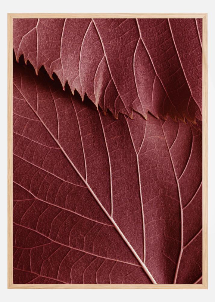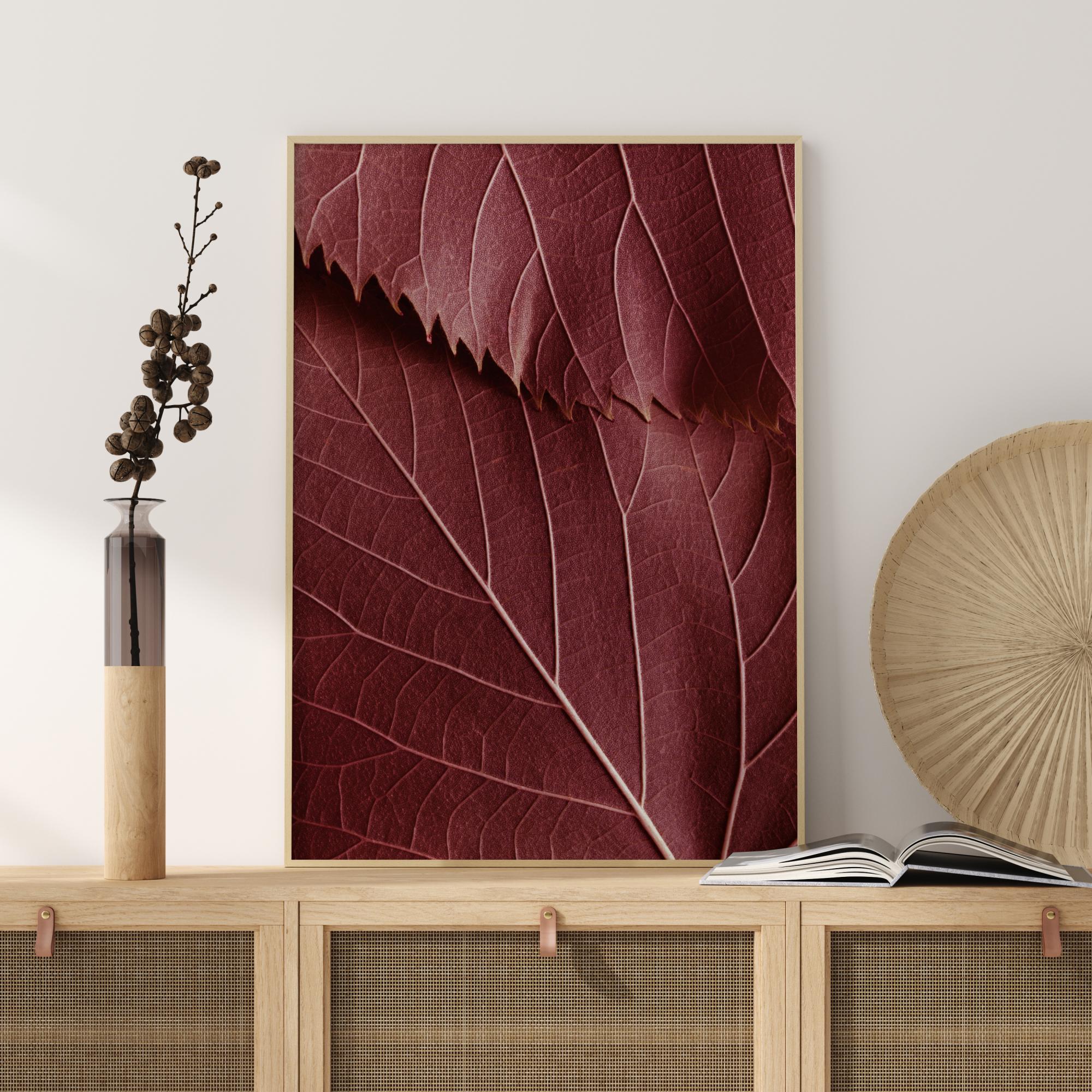 Arte fotografica botanica di foglie rosso scuro con vivaci motivi. Un poster elegante con tonalità calde, perfetto da combinare con altre splendide immagini in una grande parete di quadri.