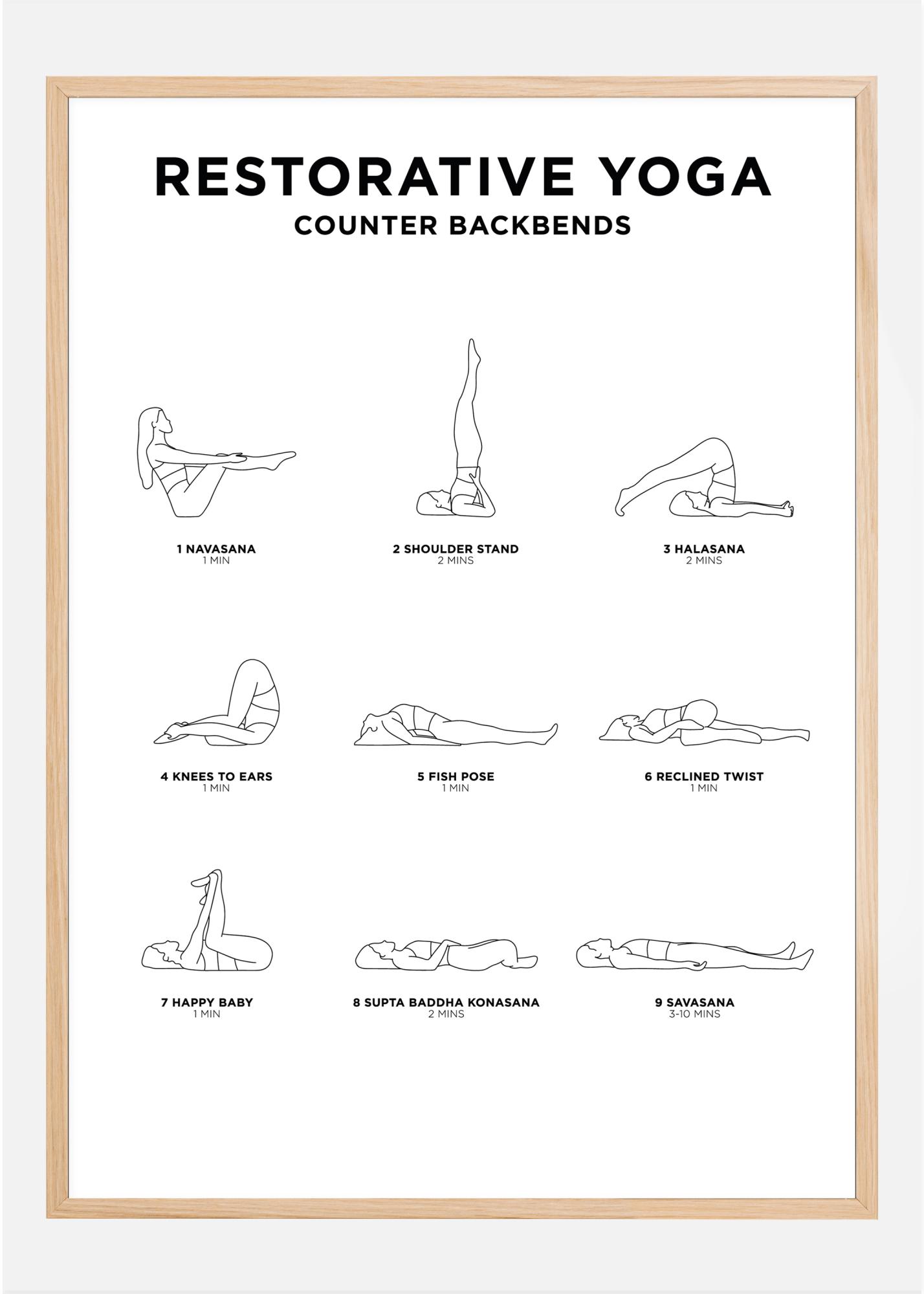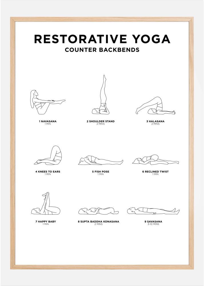Impara a rilassarti con Restorative yoga. Questo poster elegante non è solo un bel dettaglio d'arredo, ma ti fornisce anche istruzioni concrete per le posizioni di questo rilassante stile di yoga. Un poster alla moda che può essere abbinato ad altri motivi per creare una parete di quadri alla moda.