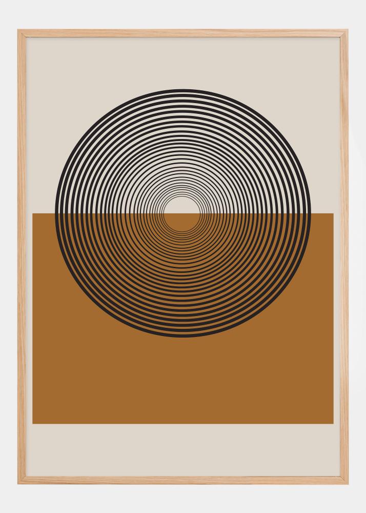 Questo elegante poster cattura l'attenzione con il suo ipnotico motivo di linee nere che formano un'illustrazione ottica raffinata, poste su uno sfondo ricco di ocra che rappresenta un orizzonte paesaggistico. La metà superiore della forma circolare dà una sensazione di tramonto o di sorgere della luna, mentre le linee fluide creano una sensazione di movimento e profondità, conferendo a quest'opera d'arte un'atmosfera retrò con un tocco moderno.