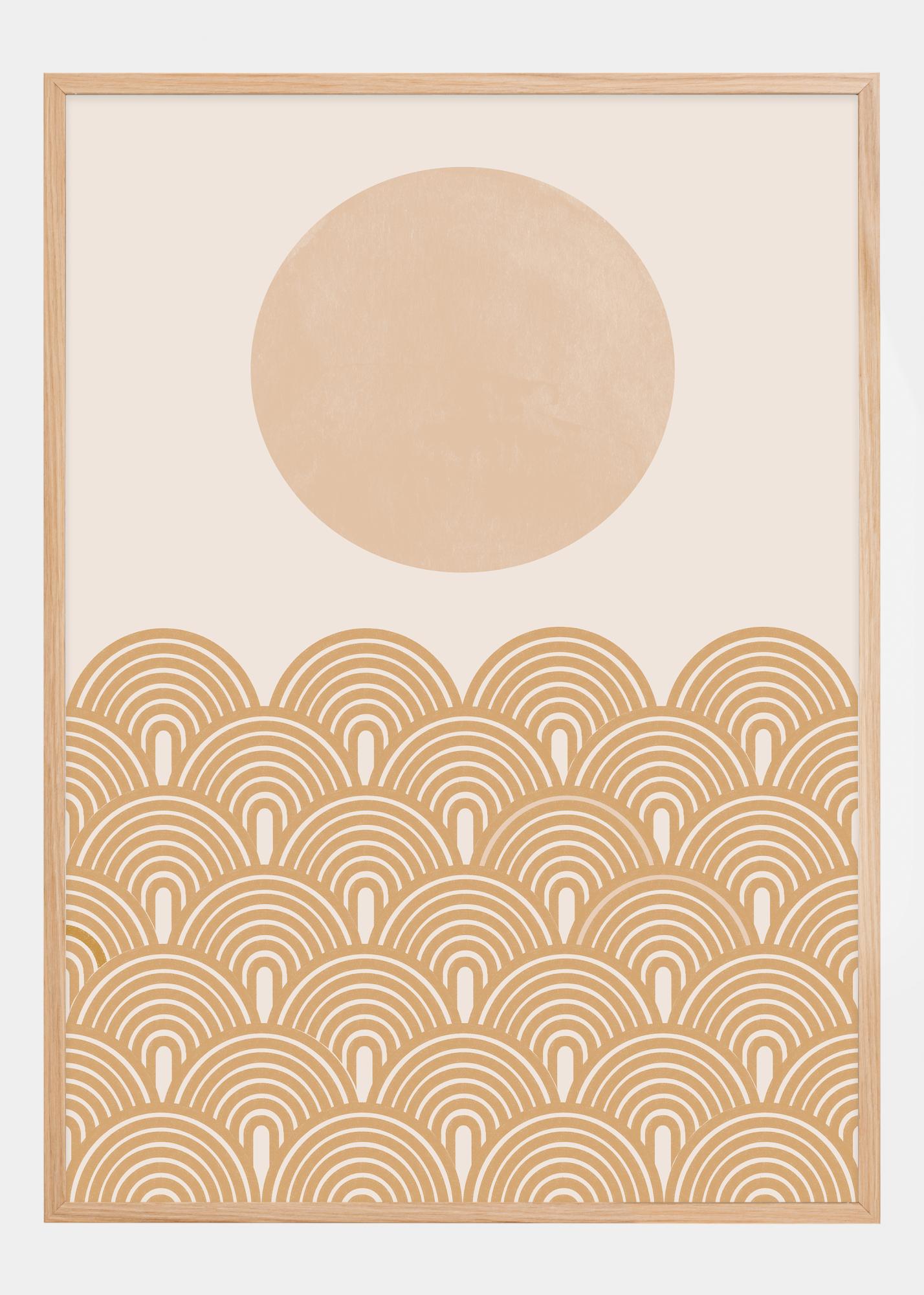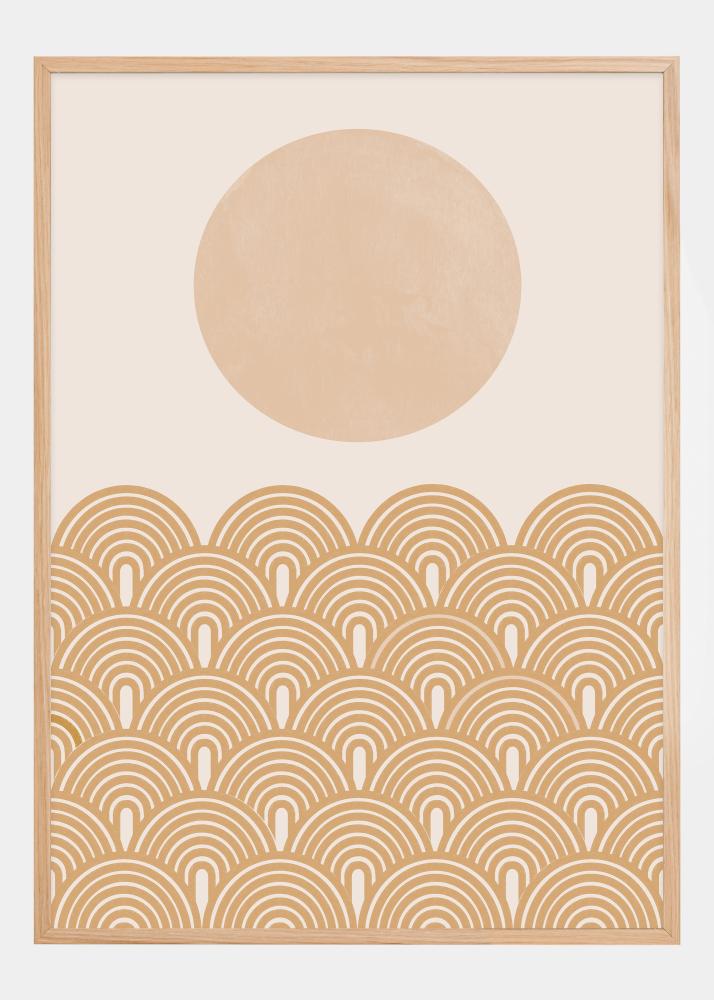 Questo poster è un'interpretazione solare degli stili retrò e delle vibrazioni estive, dove un grande cerchio rosa pallido fluttua sopra un motivo di elementi a forma di arco in una calda tonalità terracotta. Gli archi sono collegati in modo da ricordare onde o colline, offrendo una sensazione di movimento e vivacità. La soffice palette di colori contribuisce a una sensazione di calore e tranquillità.
