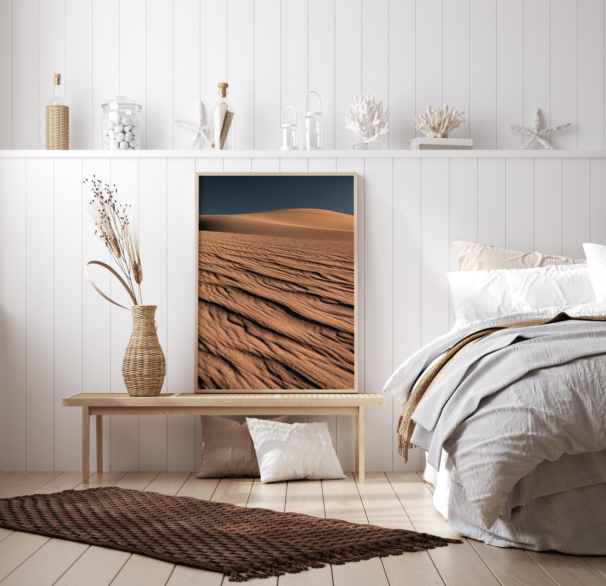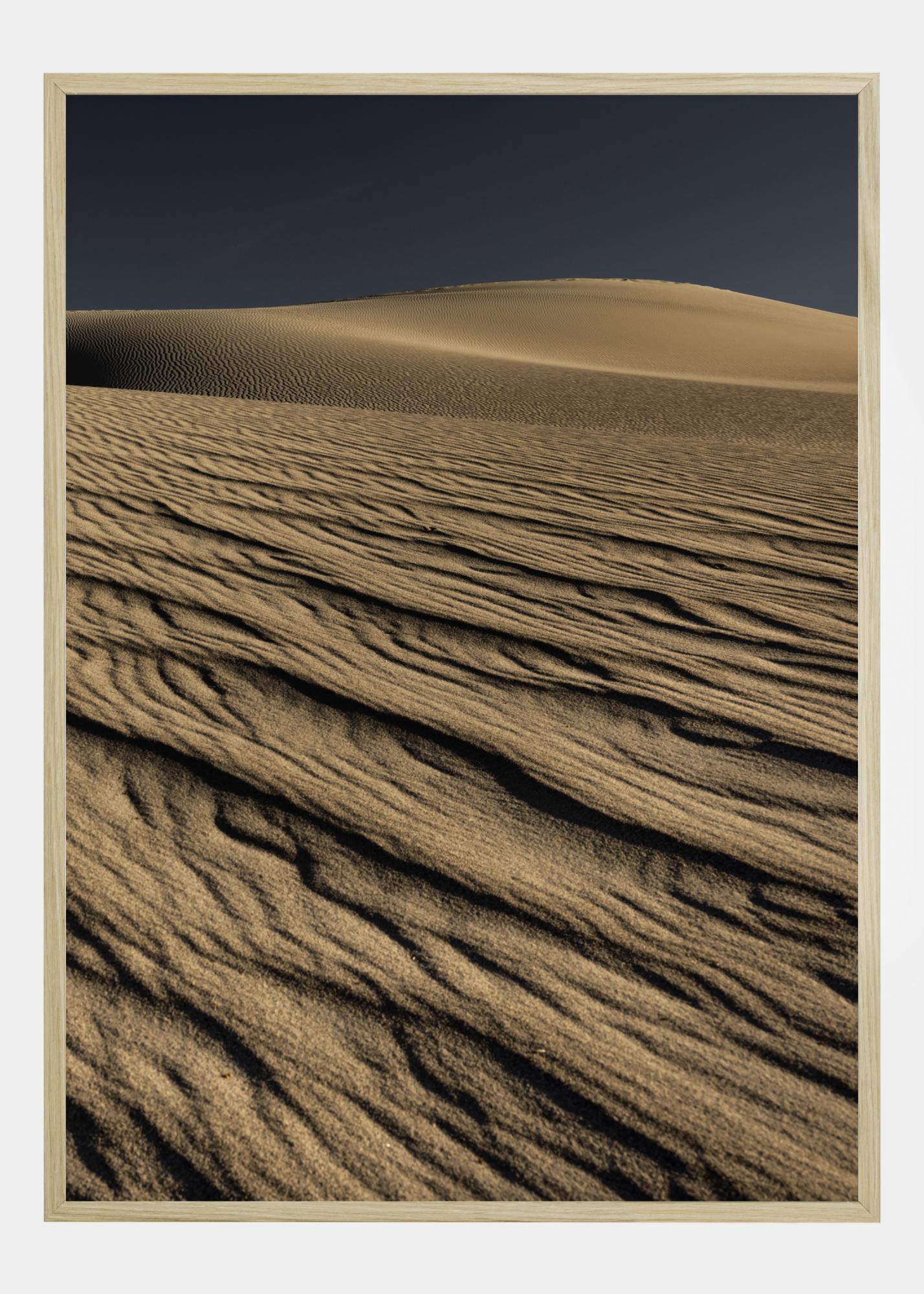 Un poster drammatico con onde di sabbia sulle dune di sabbia. Questa fantastica foto crea armonia con la sabbia gialla contrastante e il cielo blu. Porta a casa un po' di drammaticità e lascia che lo sguardo viaggi attraverso questa immagine.