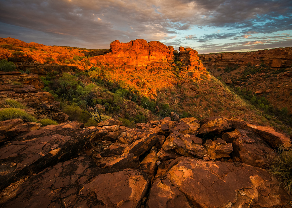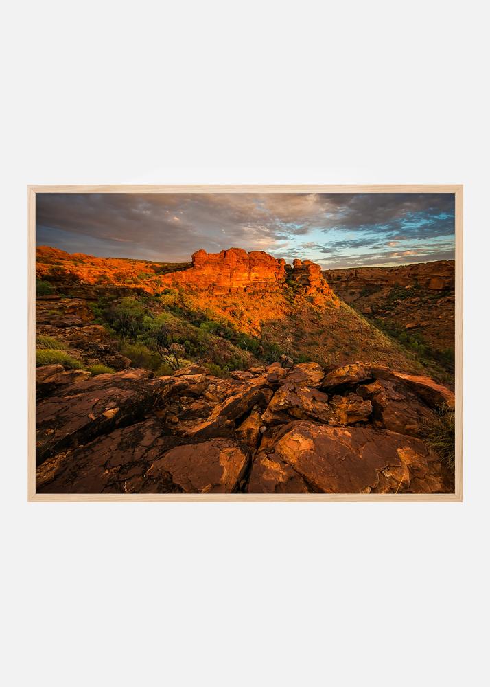 poster con una fotografia di monti rossi al tramonto, perfetto per chi ama deserti e formazioni rocciose da appendere al muro. I toni caldi del rosso contro il cielo blu ghiaccio e la profondità dell'immagine creano un motivo interessante. Incornicia il poster e appendilo su una parete insieme ad altre immagini del deserto.