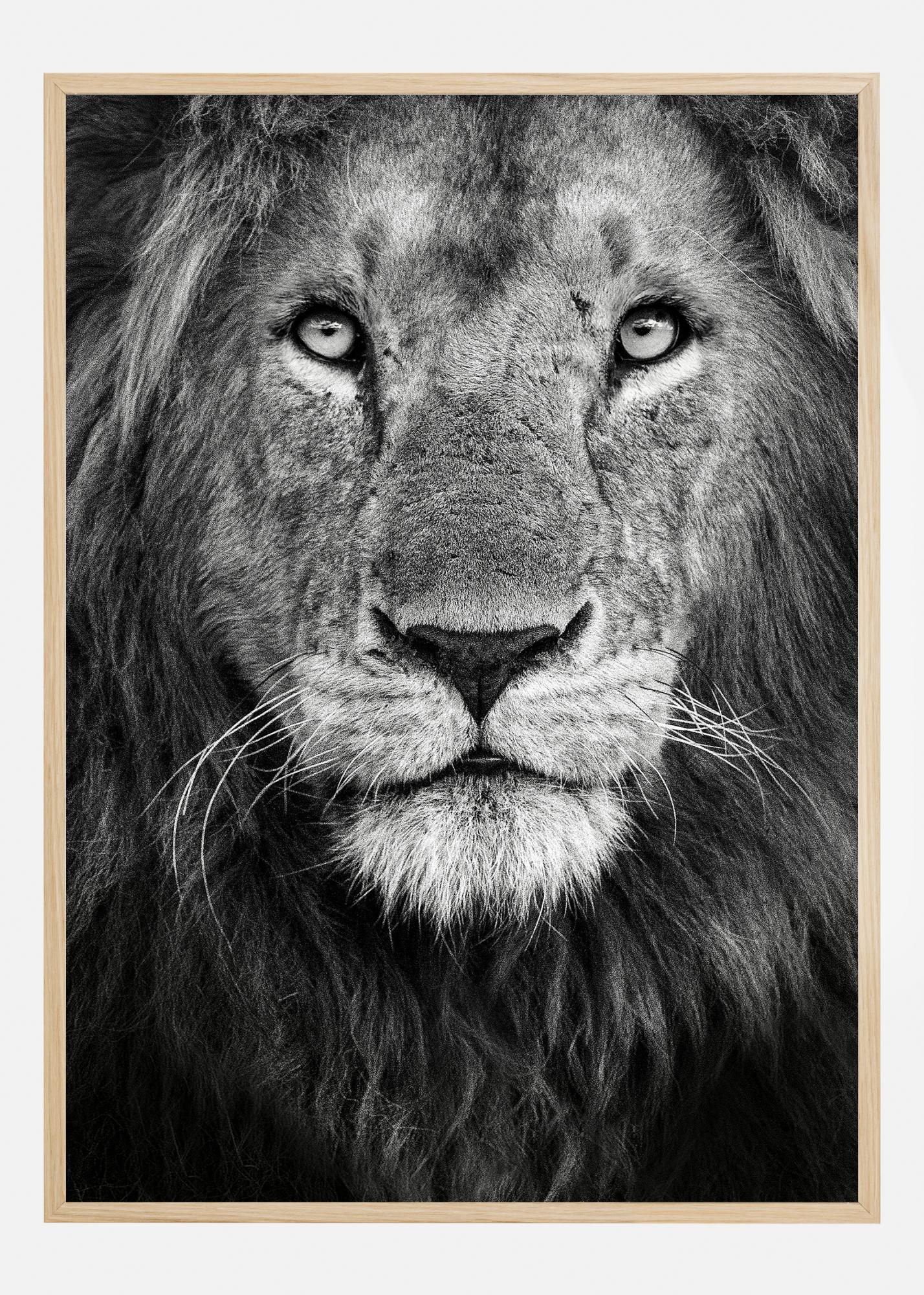 Questo poster potente ed espressivo presenta un ritratto ravvicinato di un leone maschio in bianco e nero, che cattura la presenza maestosa dell'animale e la sua essenza selvaggia. Lo sguardo intenso del leone, la sua folta criniera e ogni singolo baffo prendono vita grazie all'elevato contrasto e alla ricchezza di dettagli nella fotografia. Questo è un motivo che attira immediatamente l'attenzione e crea un'impressione profonda e duratura.