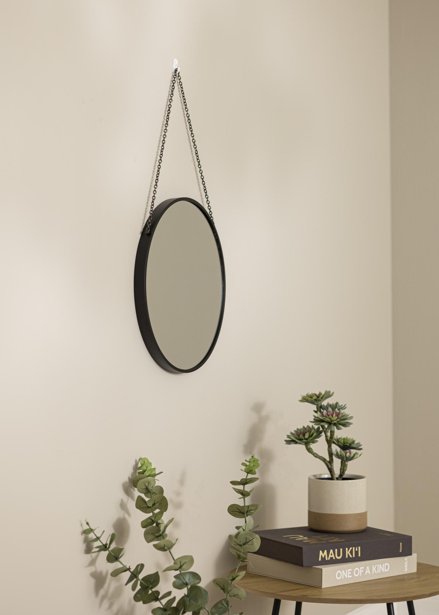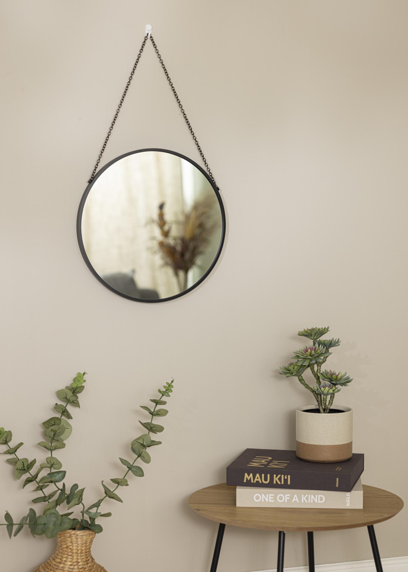 Uno specchio rotondo è un classico per una ragione! La forma morbida crea grande eleganza nella tua casa e si contrappone alle linee rette dell'arredamento. Questo è un modello con una cornice profonda di 28 mm e una raffinata tonalità nera che può essere facilmente abbinata ad altri dettagli d'arredo. La cornice dello specchio è realizzata in metallo. Lo specchio viene appeso a una catena nera, che aumenta ulteriormente la sensazione di eleganza.