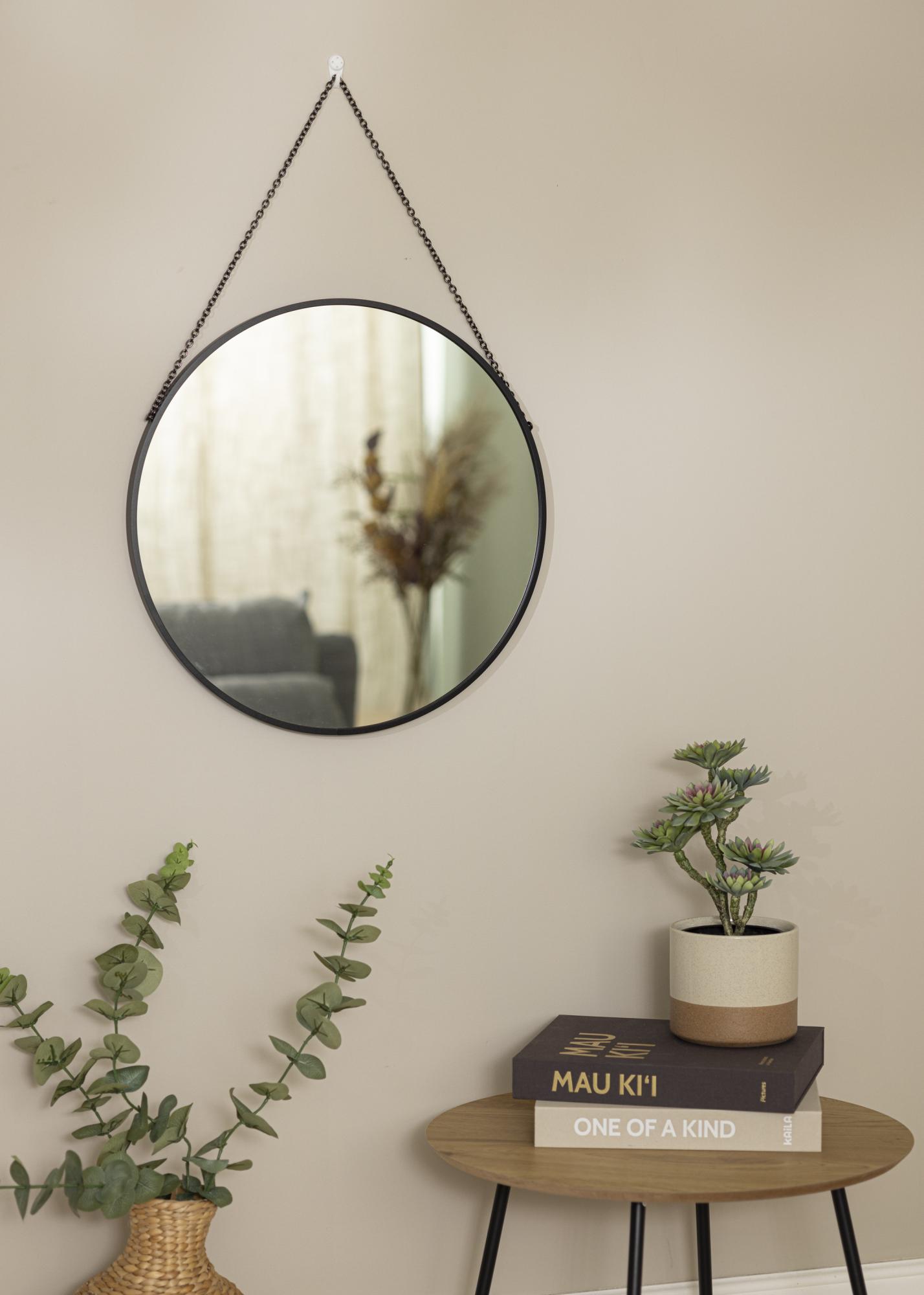 Uno specchio rotondo è un classico per una ragione! La forma morbida crea grande eleganza nella tua casa e si contrappone alle linee rette dell'arredamento. Questo è un modello con una cornice profonda di 28 mm e una raffinata tonalità nera che può essere facilmente abbinata ad altri dettagli d'arredo. La cornice dello specchio è realizzata in metallo. Lo specchio viene appeso a una catena nera, che aumenta ulteriormente la sensazione di eleganza.