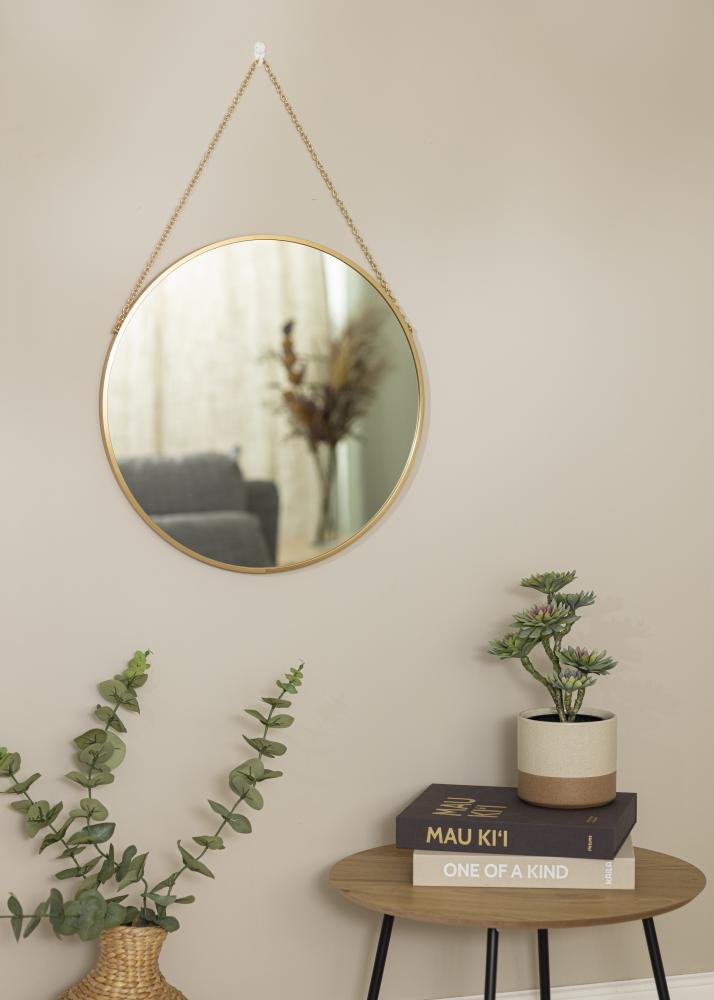 Questo è uno specchio da parete che combina perfettamente funzionalità ed eleganza. Ha un design elegante con una forma rotonda morbida e una cornice di lusso dorata con una profondità di 28 mm. Come ciliegina sulla torta, lo specchio da parete è dotato di una catena dorata elegante per appenderlo.
