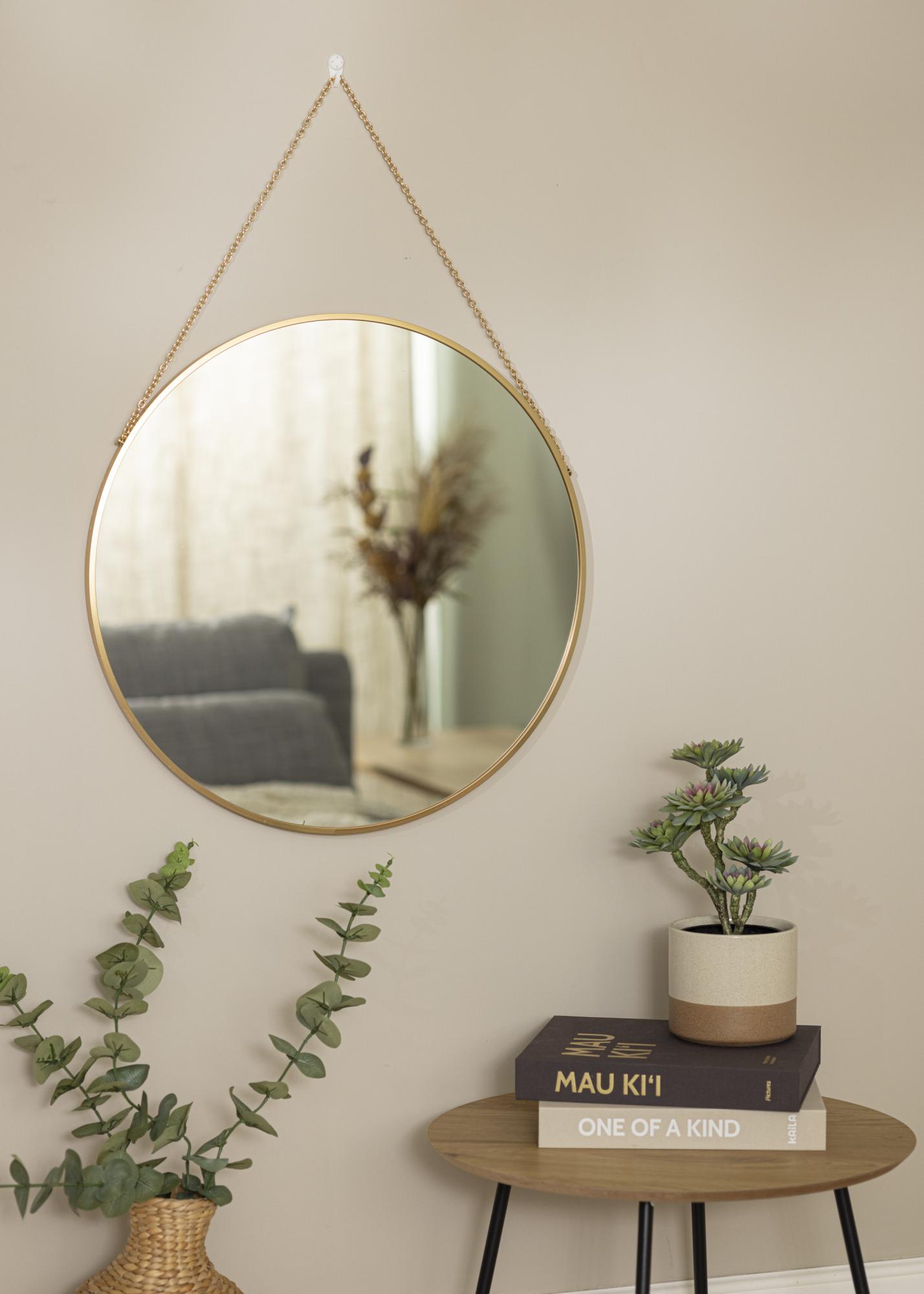 Questo è uno specchio da parete che combina perfettamente funzionalità ed eleganza. Ha un design elegante con una forma rotonda morbida e una cornice di lusso dorata con una profondità di 28 mm. Come ciliegina sulla torta, lo specchio da parete è dotato di una catena dorata elegante per appenderlo.