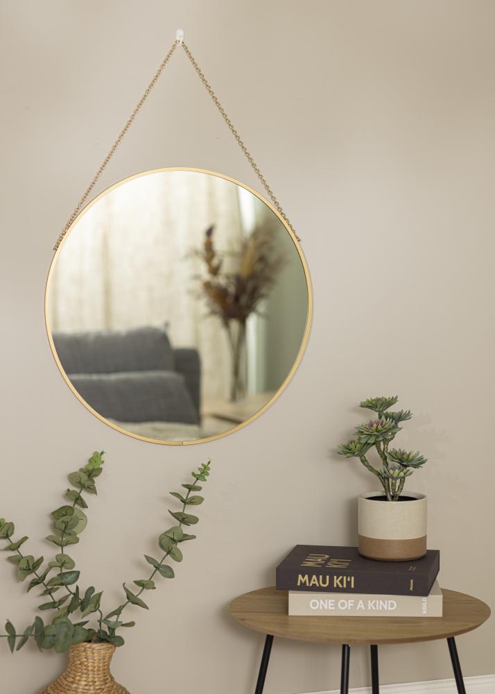 Lascia che questo specchio da parete aggiunga eleganza alla tua casa! Lo specchio ha un aspetto sofisticato con una forma rotonda e una sottile cornice specchiata con una profondità di soli 8 mm. La cornice compatta è realizzata in metallo e ha un esclusivo colore oro. L'impressione elegante è completata dalla catena dorata utilizzata per l'appendere.