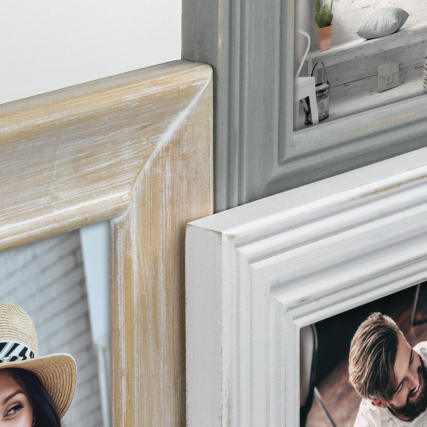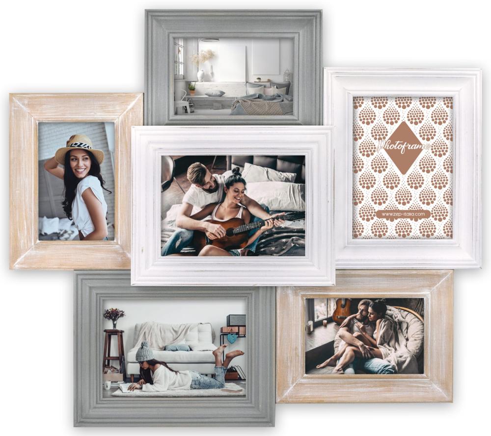 Bella Cornice multipla dal design rustico con spazio per 6 foto di dimensioni 10x15 cm e 13x18 cm. La Cornice multipla è disponibile in una tonalità beige, grigia e bianca e può essere abbinata perfettamente ad altre decorazioni murali e quadri. Realizzata in legno. Supporto da parete incluso.
