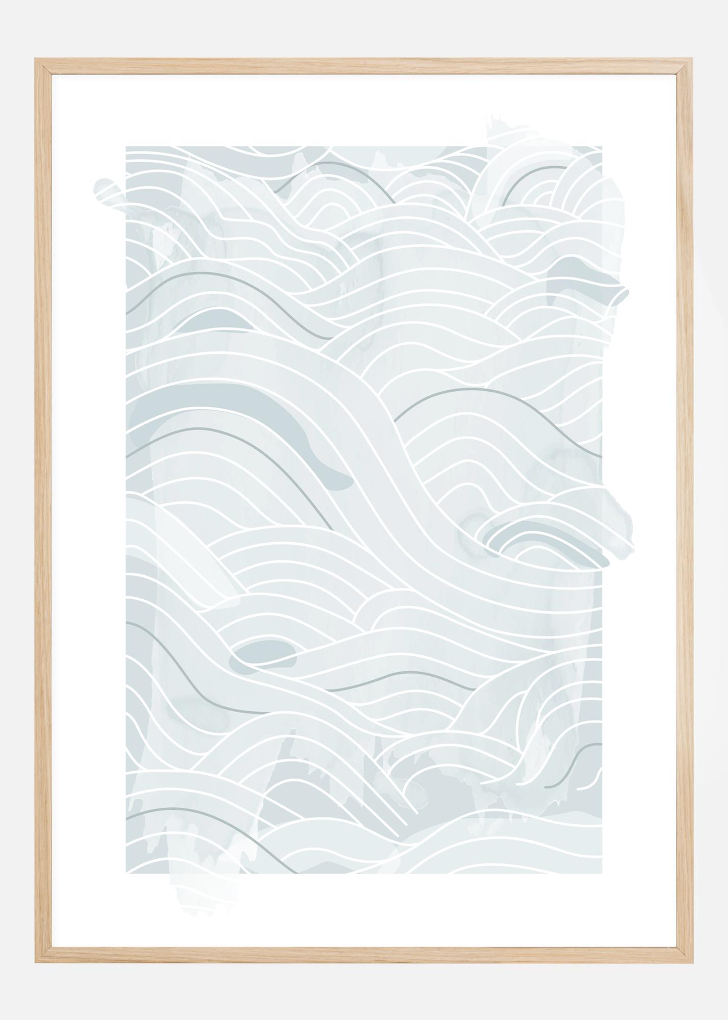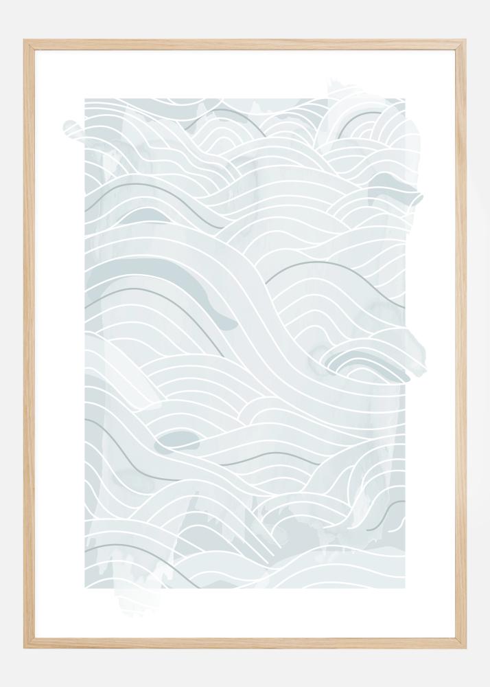 Un poster marino con morbide linee blu astratte e onde su uno sfondo bianco. Diverse tonalità di blu e spessori di linea diversi si combinano per creare queste onde fluide sulla pagina. Lascia che la mente vaghi e lasciati trasportare da questo morbido motivo marino.