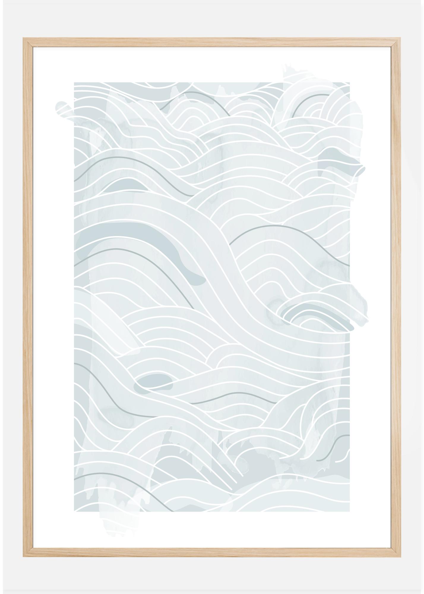 Un poster marino con morbide linee blu astratte e onde su uno sfondo bianco. Diverse tonalità di blu e spessori di linea diversi si combinano per creare queste onde fluide sulla pagina. Lascia che la mente vaghi e lasciati trasportare da questo morbido motivo marino.