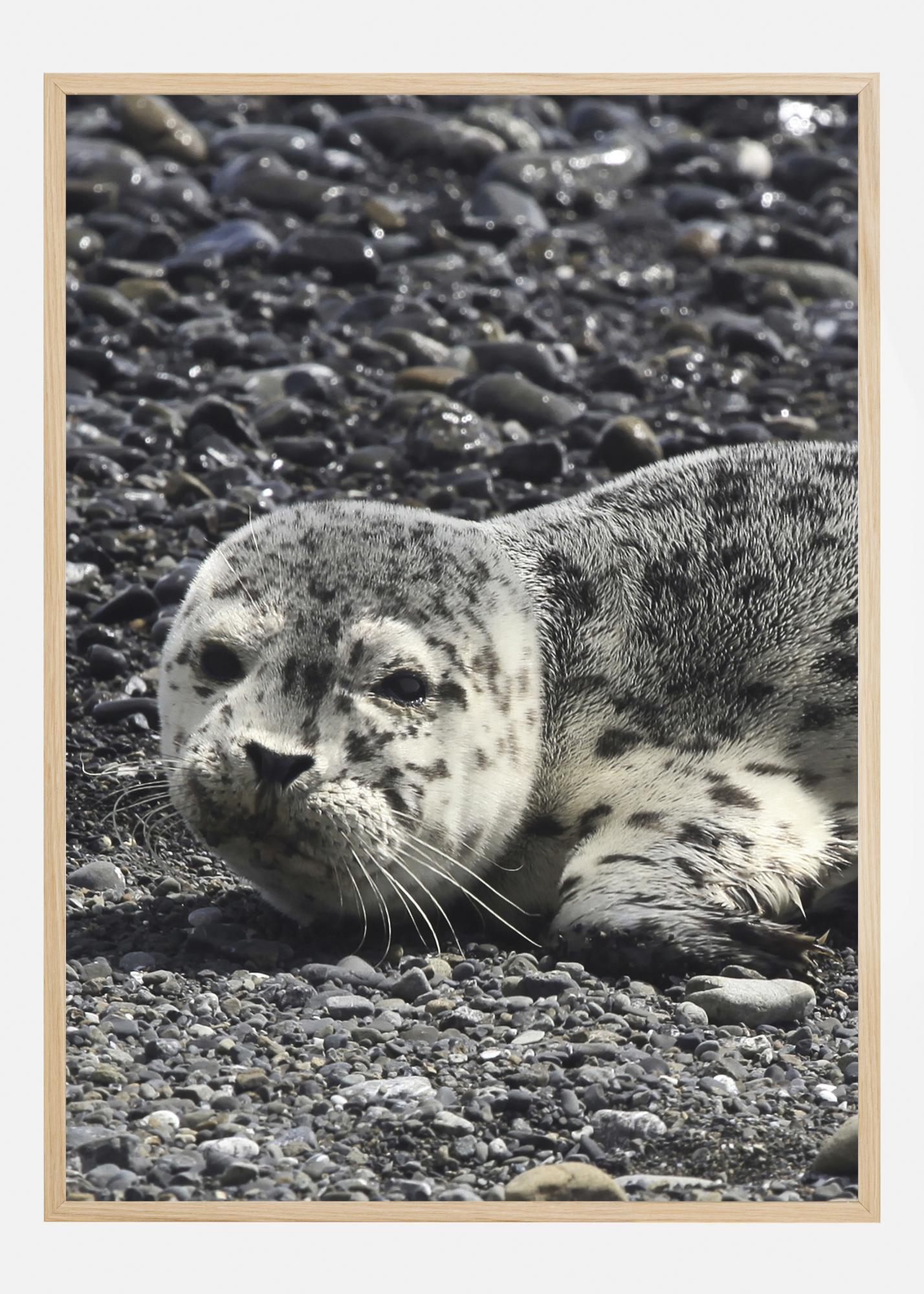 Un bellissimo poster con una foca su una spiaggia rocciosa. Una foca grigia si trova sulle rocce, quasi completamente mimetizzata. Le macchie sul suo pelo riflettono le rocce dietro di essa. Fissa gli occhi saturi di anima di questo mammifero marino mentre porti a casa questa immagine.