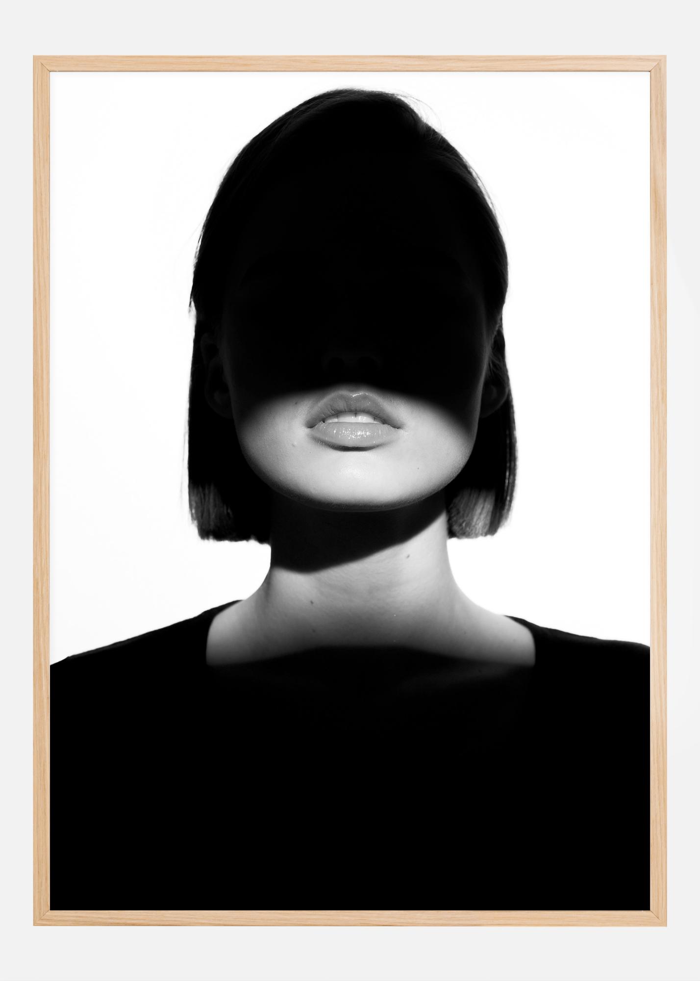 Questa sorprendente locandina cattura l'immagine potente di una donna i cui occhi sono nascosti da un'ombra scura, conferendo un effetto misterioso e stimolante. Il forte contrasto tra i punti salienti bianchi e le tonalità nere profonde accentua le sue labbra marcate e i tratti scultorei del viso. È un'immagine che bilancia al limite tra visibilità e anonimato, luce e oscurità, e che invita lo spettatore a cercare significati più profondi.