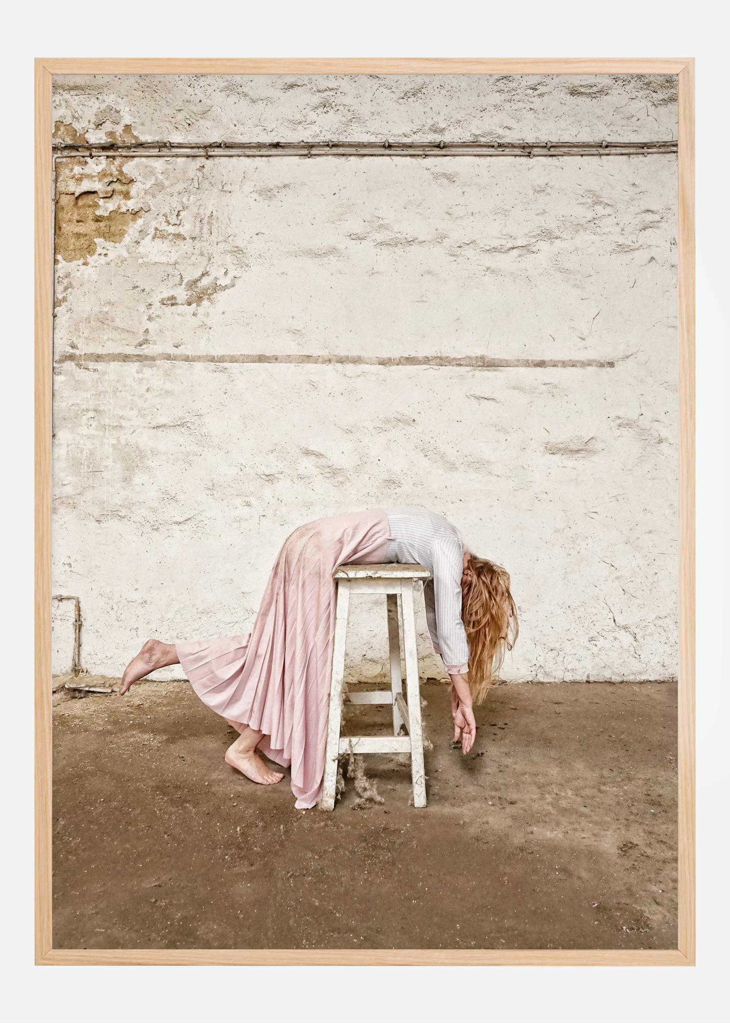 Questo poster avvincente cattura una scena insolita e carica di emozioni. Una persona è rappresentata in una posizione suggestiva su uno sgabello bianco e logoro, con la testa chinata e il braccio elegantemente esteso verso il pavimento di cemento spoglio. L'abbigliamento della persona consiste in una gonna rosa chiaro e una camicia a righe, che insieme allo sfondo grezzo di un muro logoro creano un forte contrasto visivo. Il colore rosa pallido della gonna e le tenui tonalità bianche e blu della camicia sono in armonia con le sfumature neutre del muro e lo sgabello di legno invecchiato.