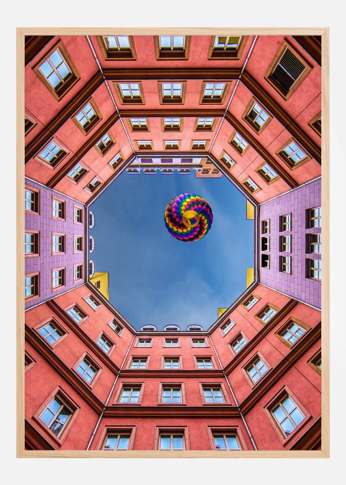 Un poster vivace con una prospettiva a rana che attraversa edifici rosa e punta verso il cielo azzurro. Gli edifici formano un esagono quando si guarda oltre tutte le finestre. Al centro del cielo blu c'è un palloncino arcobaleno che fluttua sopra l'apertura. Lasciati trasportare nella fantasia con l'aiuto di questa immagine luminosa e ottimistica.