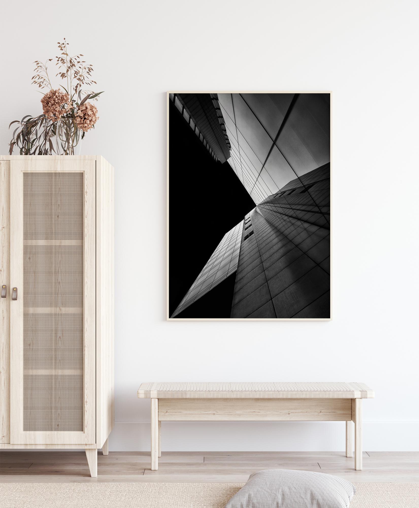 Un poster architettonico in bianco e nero con il lato di un edificio di notte. Le linee geometriche delle finestre guidano l'occhio verso il punto centrale dell'immagine. Gli edifici bianchi luminosi si riflettono nel vetro e il cielo notturno crea un forte contrasto con il lato dell'edificio. Abbinare a una parete colorata per aumentare al massimo il contrasto.