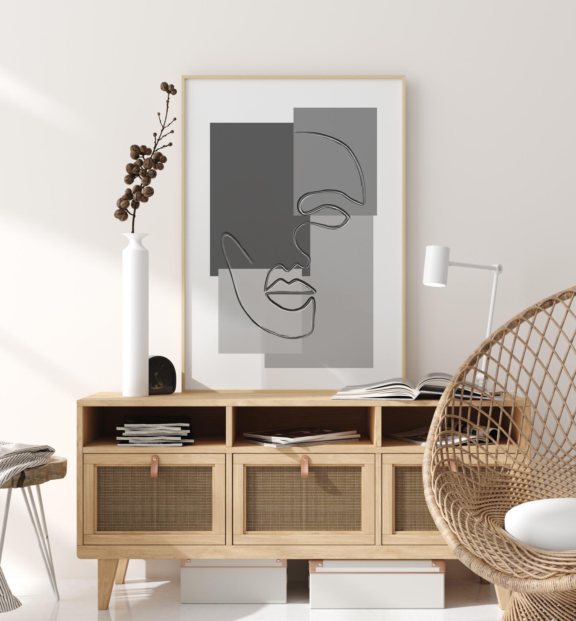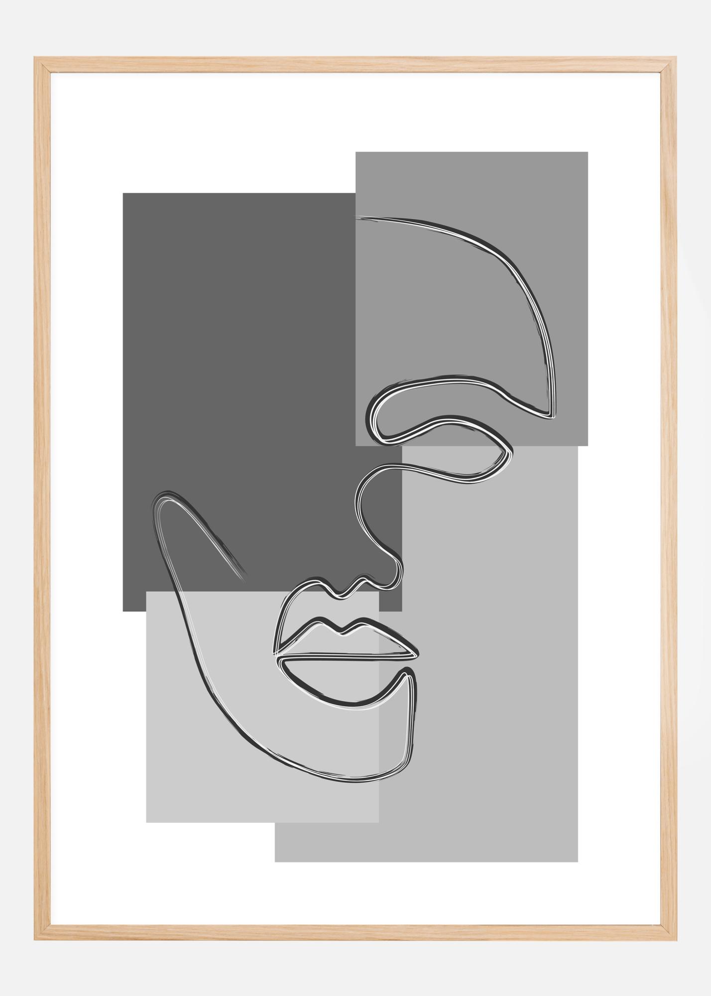 Un poster astratto con un volto disegnato sopra tre rettangoli colorati diversi. Una singola linea fluida disegna il volto dall'occhio al naso e alla bocca. Il volto si trova sopra quattro rettangoli, tutti in diverse tonalità di grigio per un aspetto più modernista.