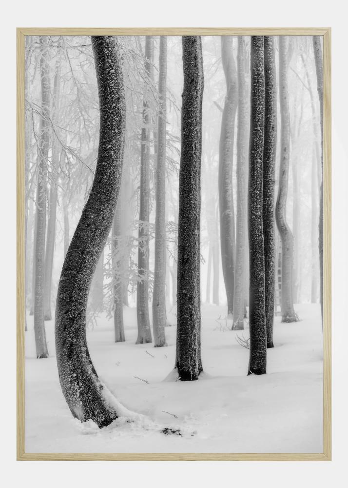 Un fantastico poster naturalistico con alberi in crescita. Questa immagine magica mostra alberi scuri in una foresta innevata. Porta a casa questo poster e porta l'inverno nella tua casa in modo fantastico.