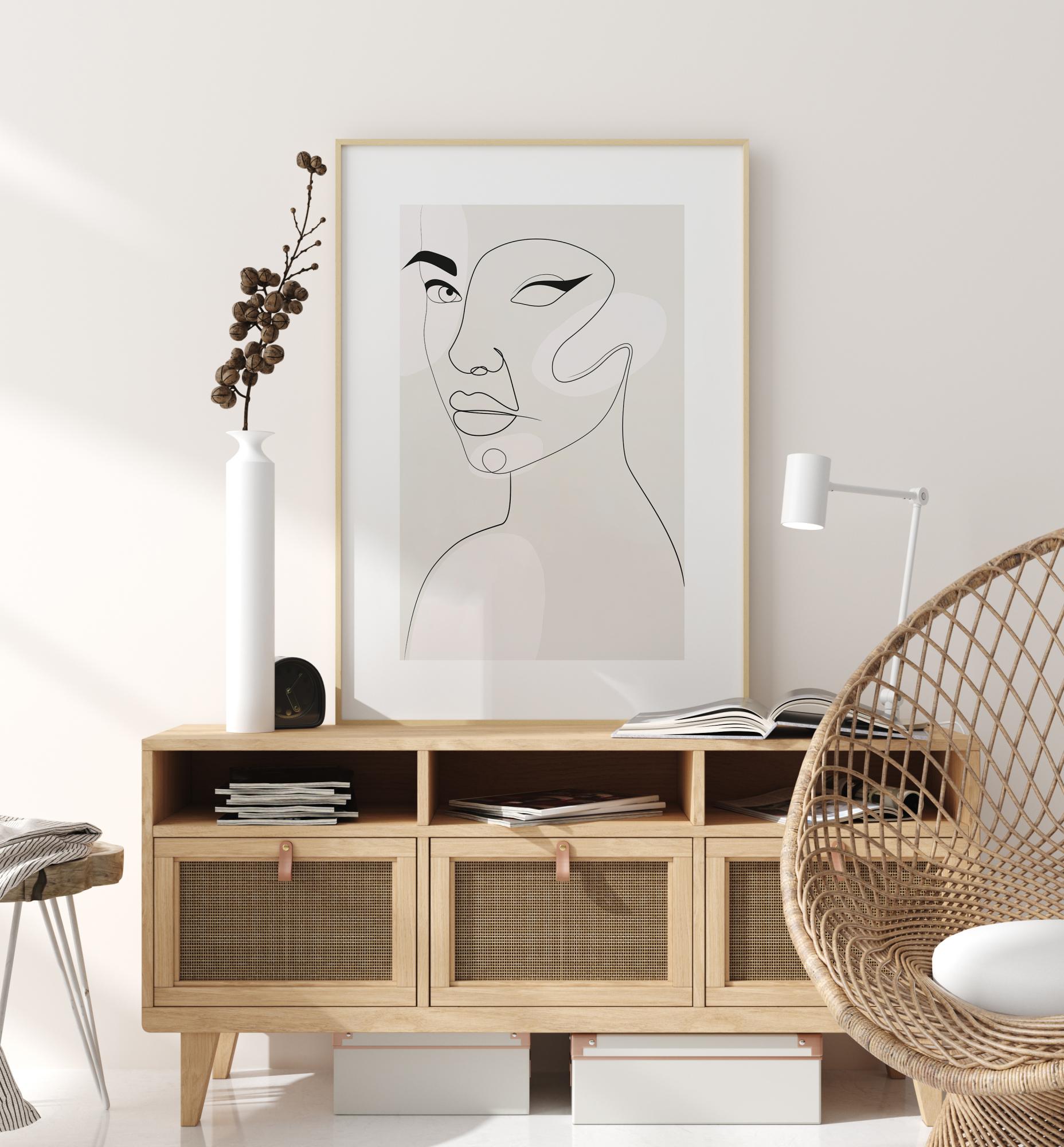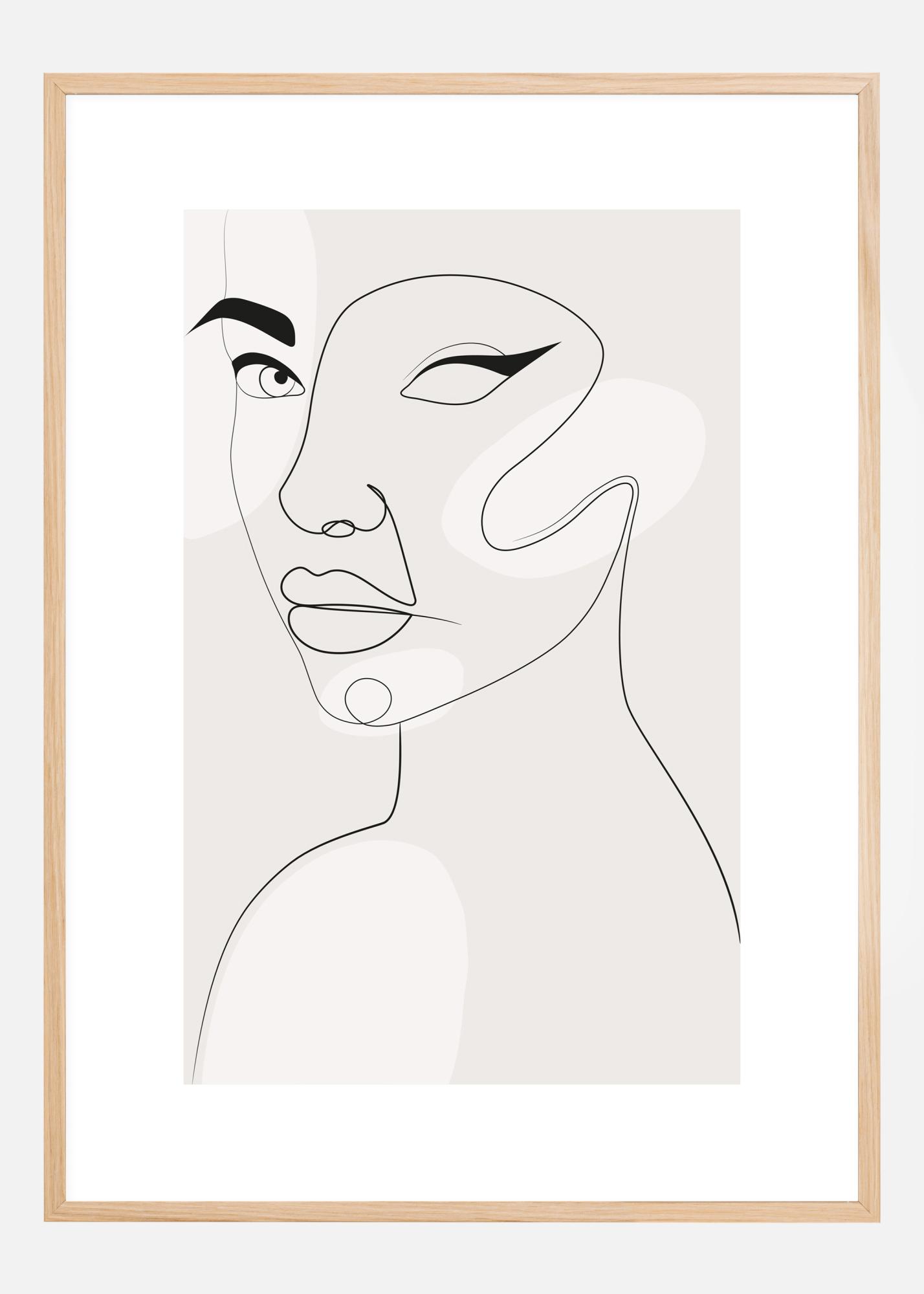 Un poster modernista con un volto di donna astratto. Linee sottili si intrecciano sulla pagina per creare il suo viso. Un occhio ti guarda con dettagli intensi. L'altro è incompleto ma ha un bellissimo eyeliner. Ha un'espressione superiore mentre ti guarda in quest'opera elegante e minimalista.