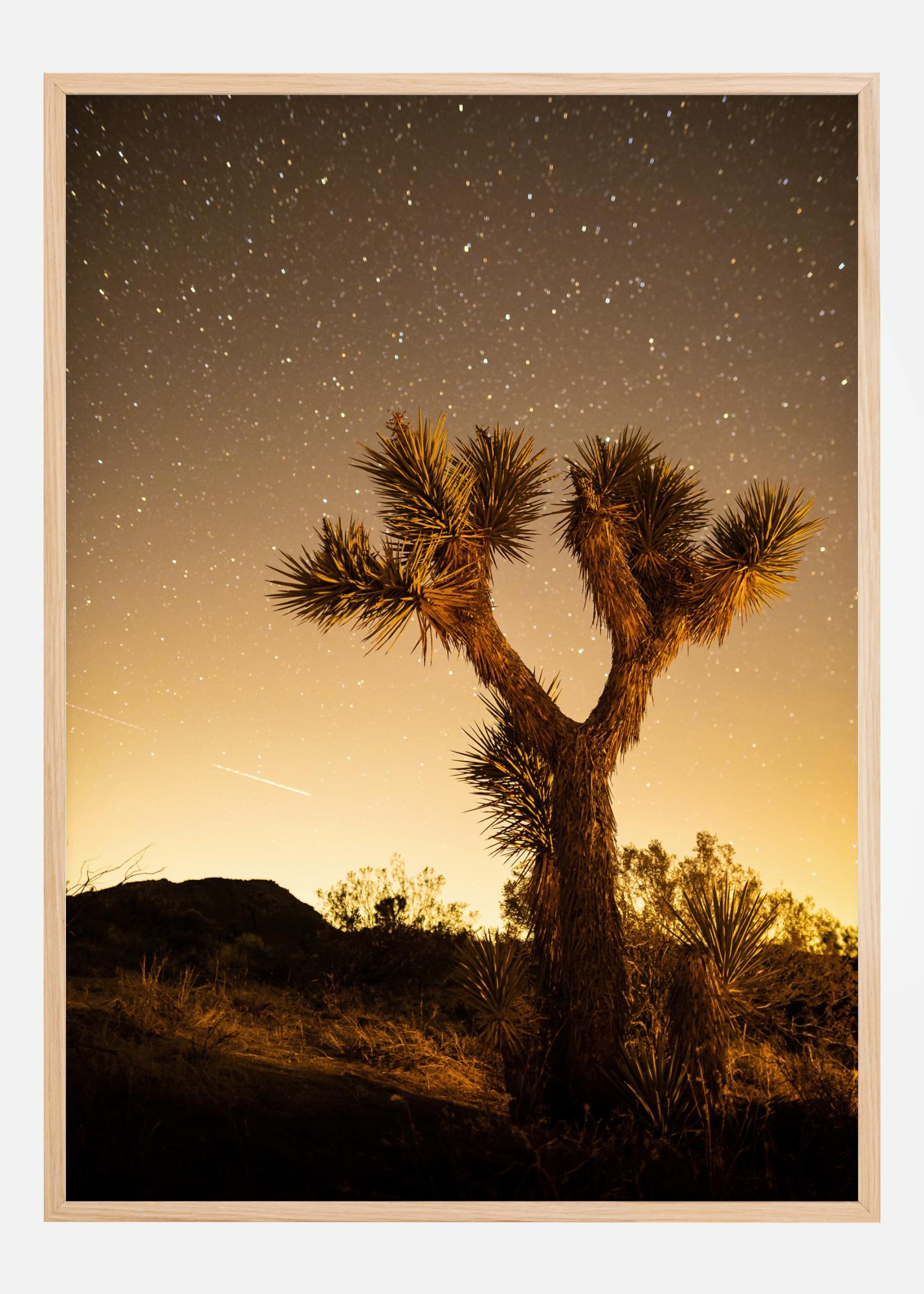 Un poster notturno con un grande cactus nel deserto che si erge alto contro un cielo notturno pieno di stelle. Il cactus è immerso in una morbida luce dorata mentre il sole tramonta all'orizzonte. Le stelle brillano delicatamente nel cielo su un'atmosfera calda e serena. Goditi il calore di questo cielo notturno nel deserto.