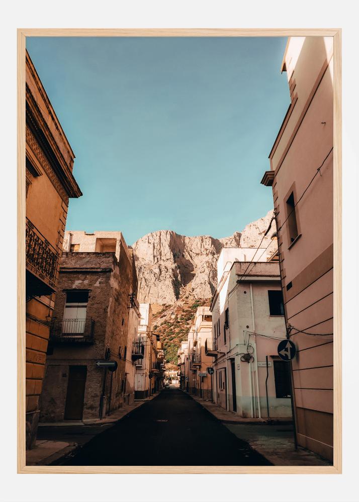 Questo incantevole poster cattura l'essenza di una pittoresca strada nel villaggio siciliano di Cinisi, con i suoi caldi colori della terra e uno sfondo dell'imponente montagna che si erge contro un cielo blu chiaro. I toni rosa pallido e giallo degli edifici contrastano magnificamente con il terreno montuoso e grezzo sullo sfondo, creando una sensazione di pace e tranquillità. Questa stampa è un omaggio al fascino rustico della Sicilia e alla sua capacità di unire natura e cultura in un insieme armonioso.