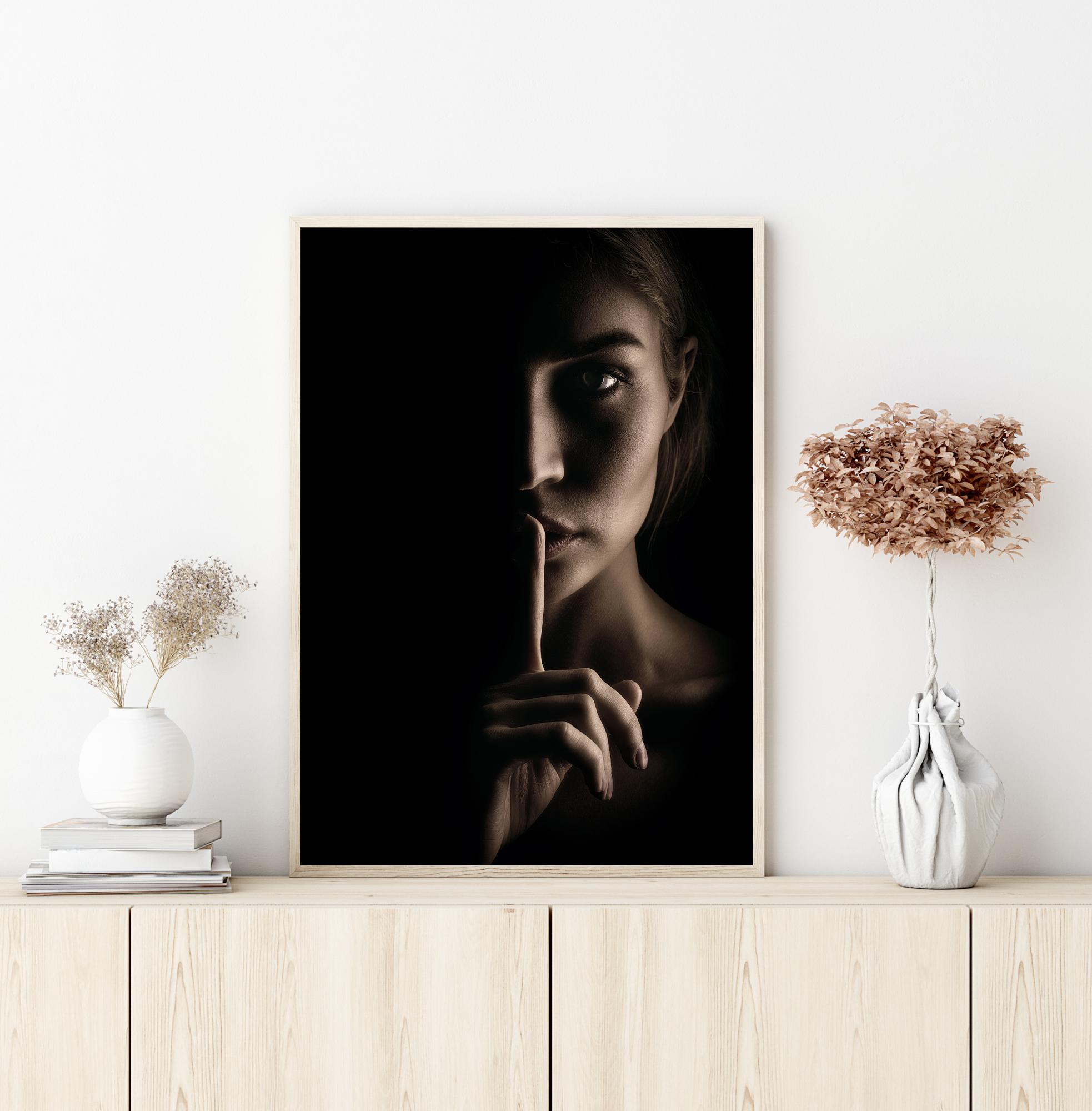 Un misterioso poster con il volto di una donna, metà in ombra. Un dito si alza verso le sue labbra per farti tacere mentre ti guarda dritto negli occhi. L'illuminazione drammatica crea una luce morbida da un lato, mentre lei cade nell'ombra dall'altro.