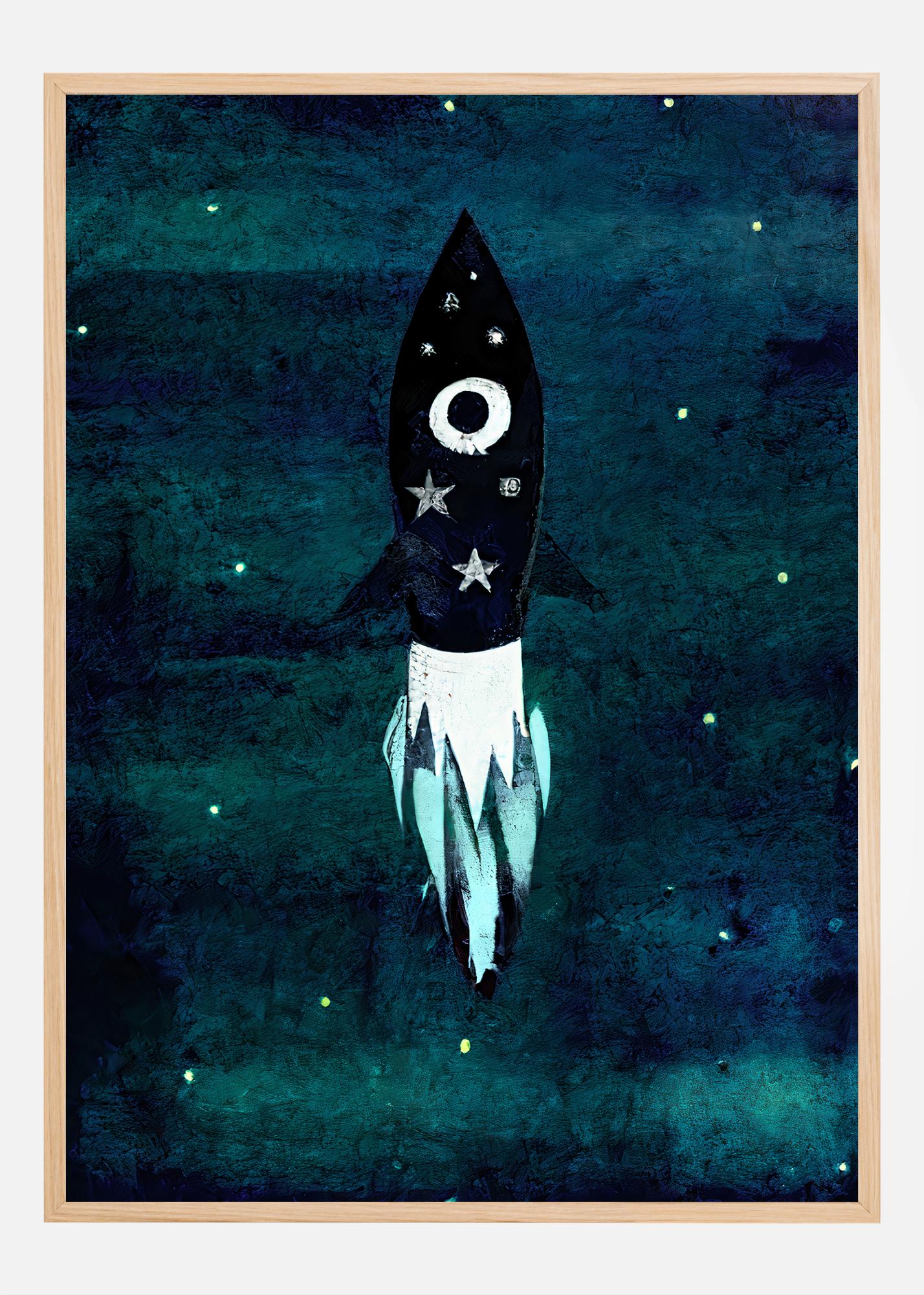 Mette in risalto una fantasia stellata con questo poster, che raffigura un razzo in un viaggio di scoperta attraverso un cosmo ricco di colori. Lo sfondo blu profondamente saturo è punteggiato da punti di luce che assomigliano a stelle e danno l'illusione di uno spazio infinito. Il razzo stesso, decorato con stelle d'argento e la luna, diventa un simbolo del sogno dell'umanità di viaggi spaziali ed esplorazione dell'ignoto.