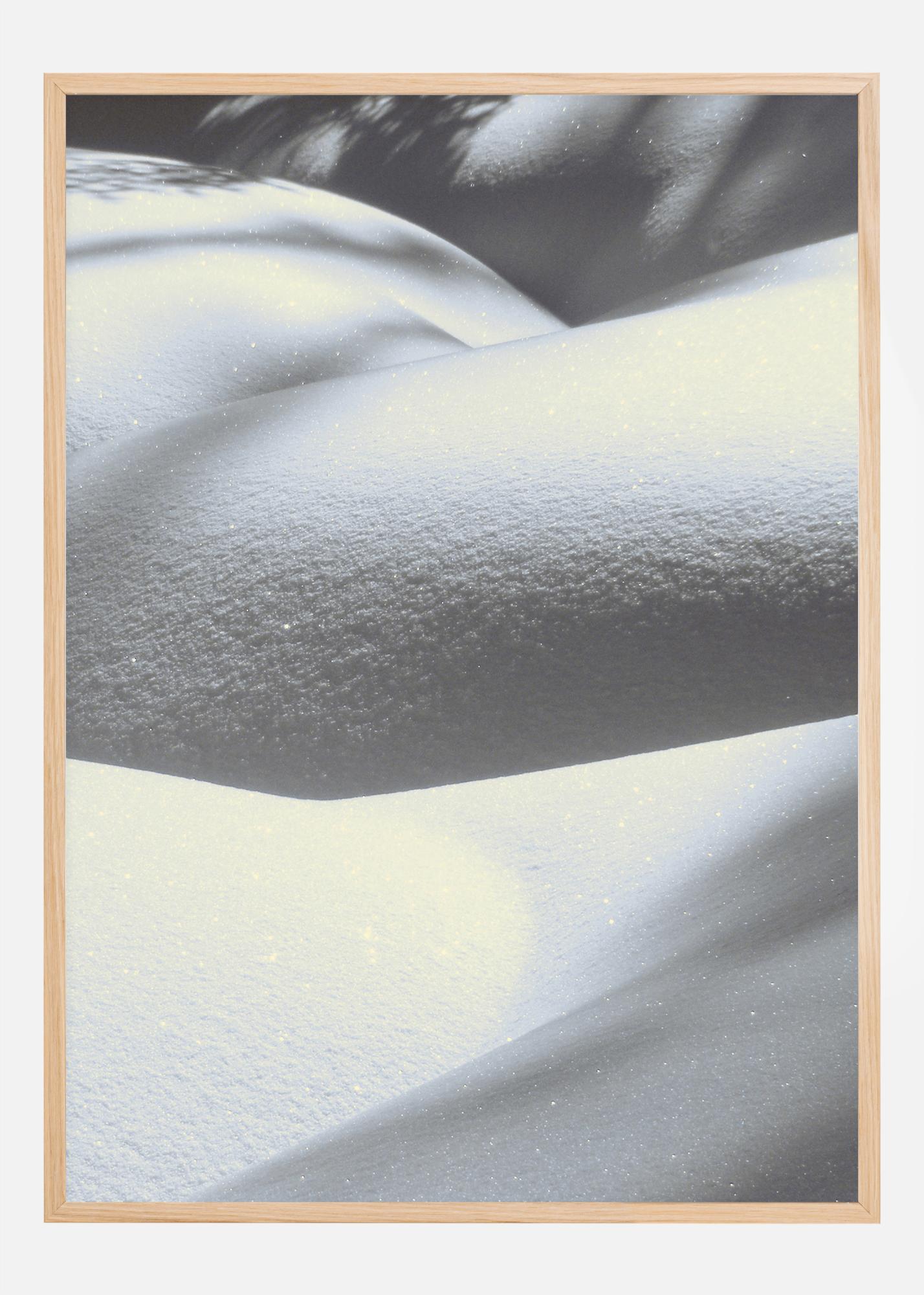 Un poster bianco con la neve su colline ondulate. Questa immagine è una miscela di bianco e grigio quando la neve rotola sul paesaggio e crea diversi modelli e forme. La neve nasconde tutto e lascia tutto alla tua fantasia, proprio come questa immagine.