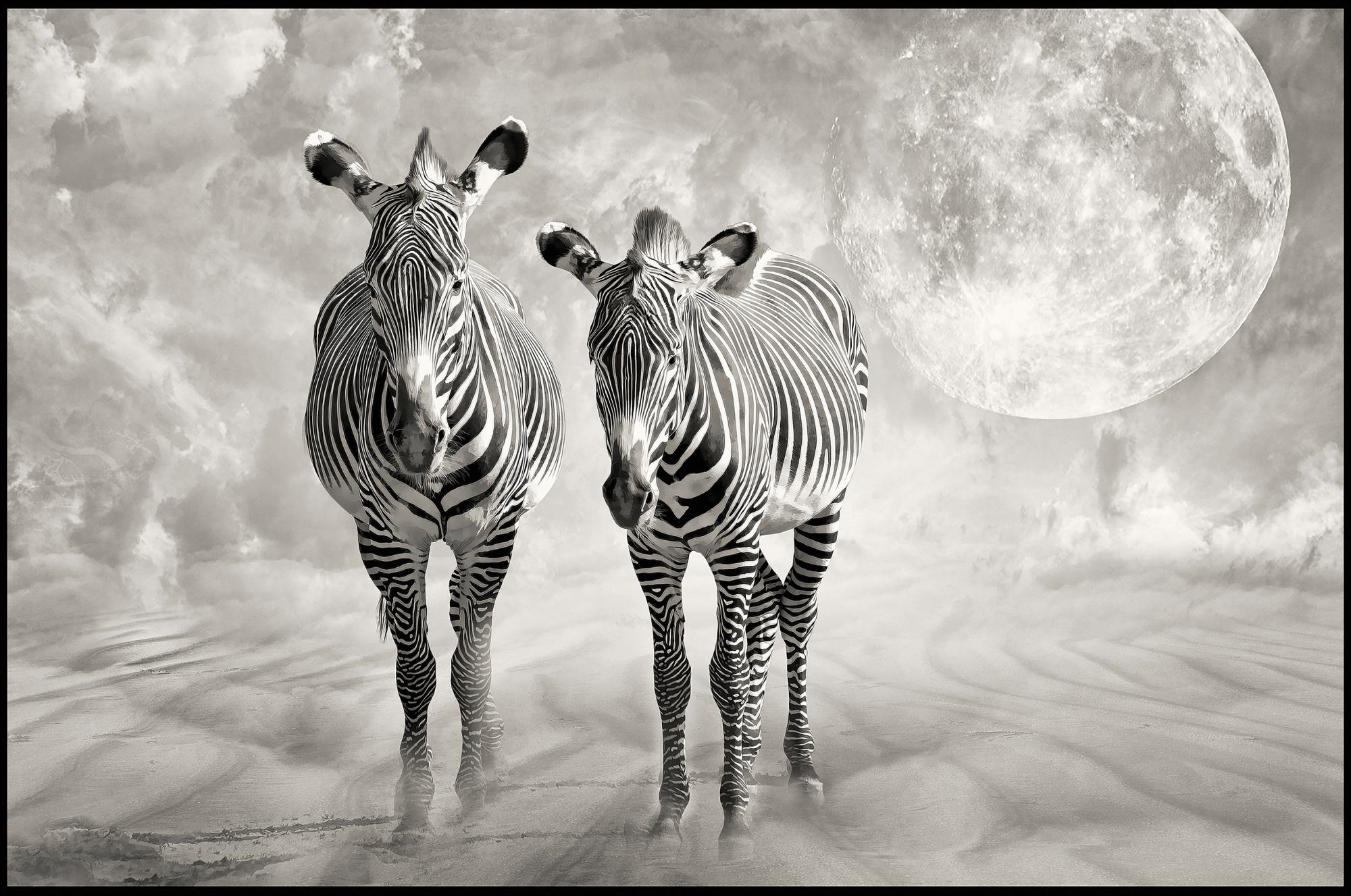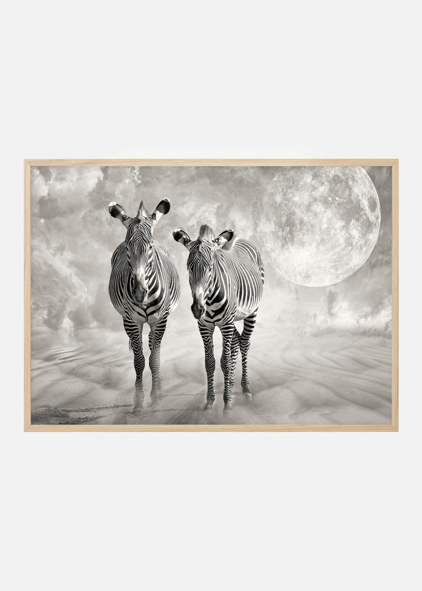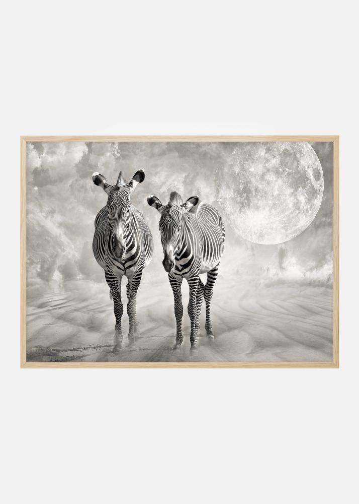 Un poster fantastico con due zebre che camminano insieme su una polvere ondulante e una grande luna piena dietro. L'immagine è delicatamente nera, bianca e argentata e crea un effetto magico come se la luna stesse illuminando queste anime gemelle. Senti la meraviglia di questa stampa eterea.