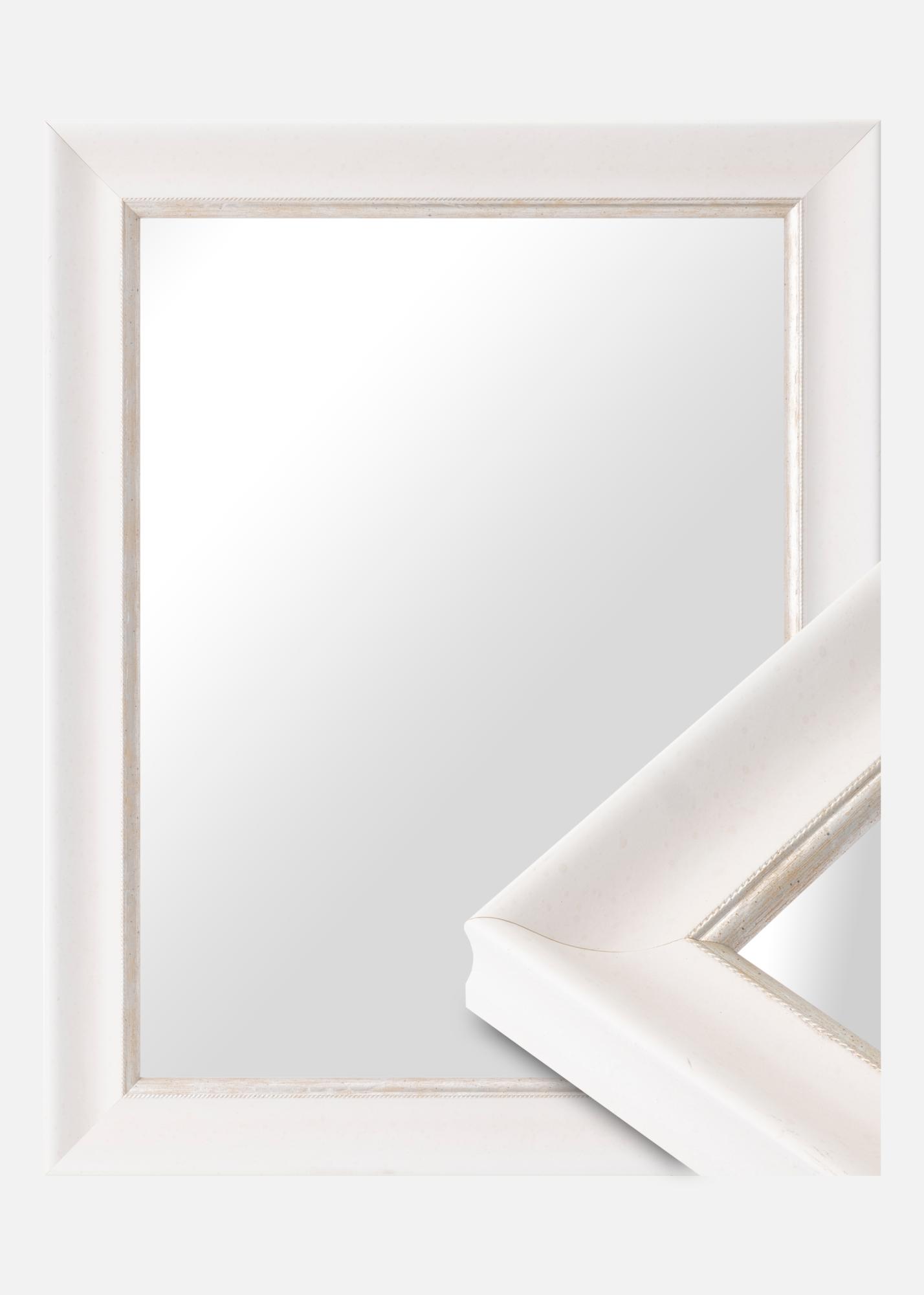 Specchio solido di qualsiasi dimensione con un profilo classico bianco. Vicino all'immagine c'è un elegante bordo argentato che conferisce allo specchio un'ulteriore lucentezza.