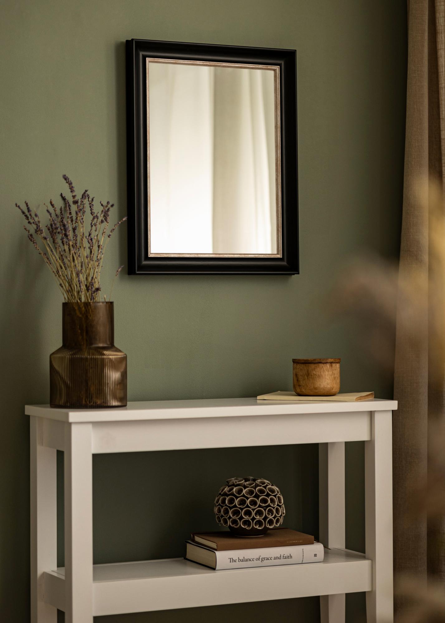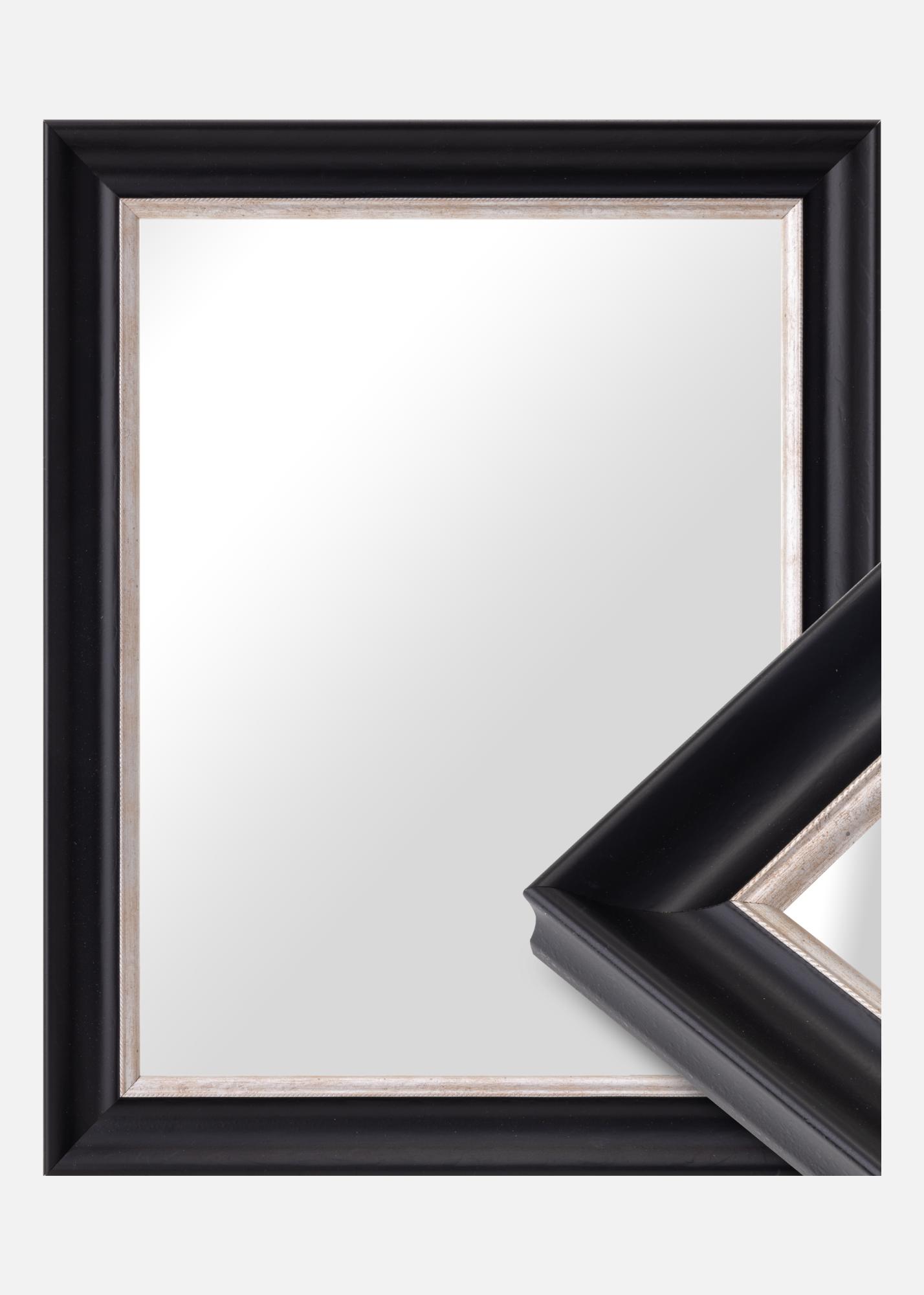 Specchio di lusso di qualsiasi dimensione con un profilo classico nero. Vicino all'immagine c'è un elegante bordo argentato che conferisce allo specchio un'ulteriore lucentezza.