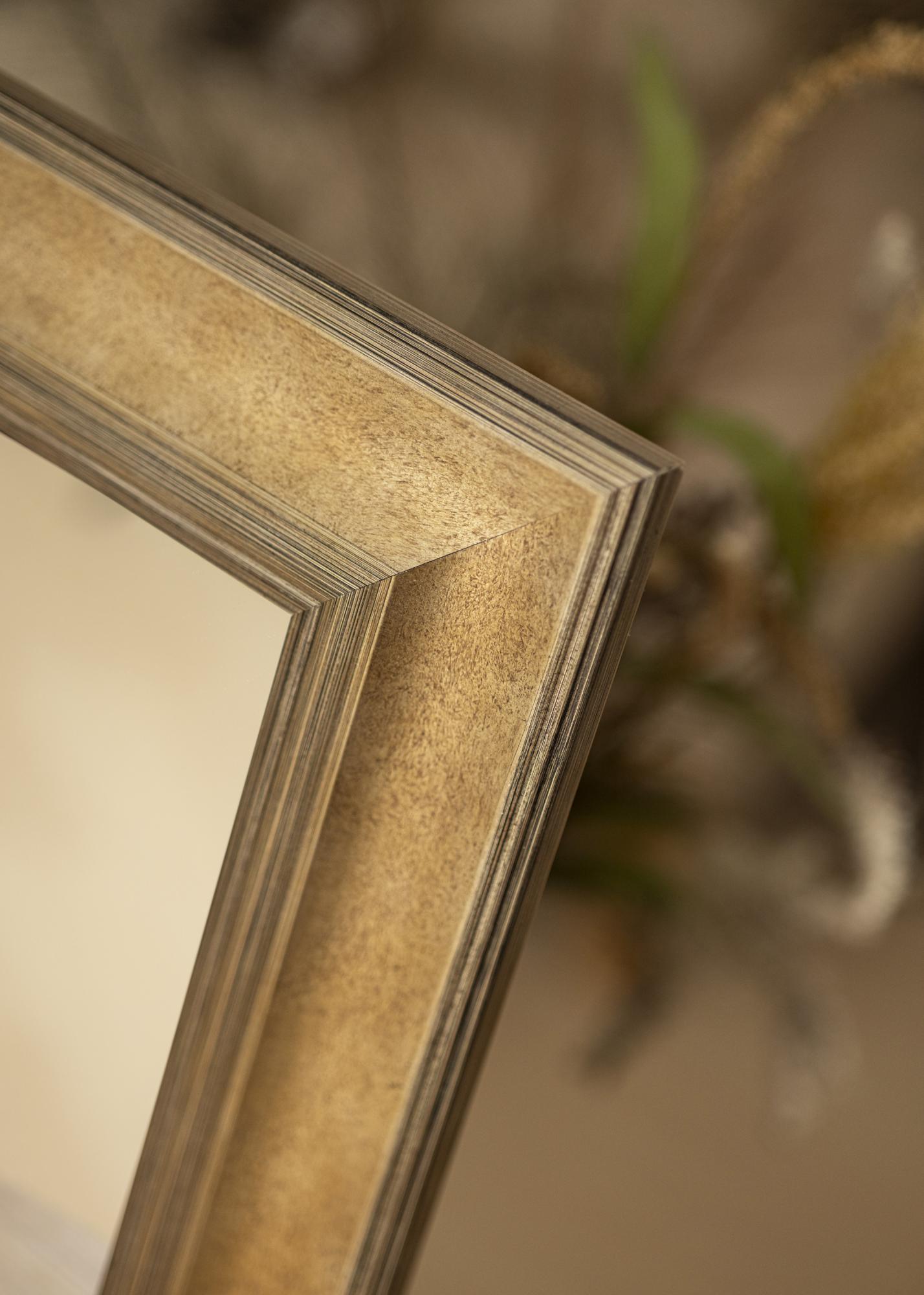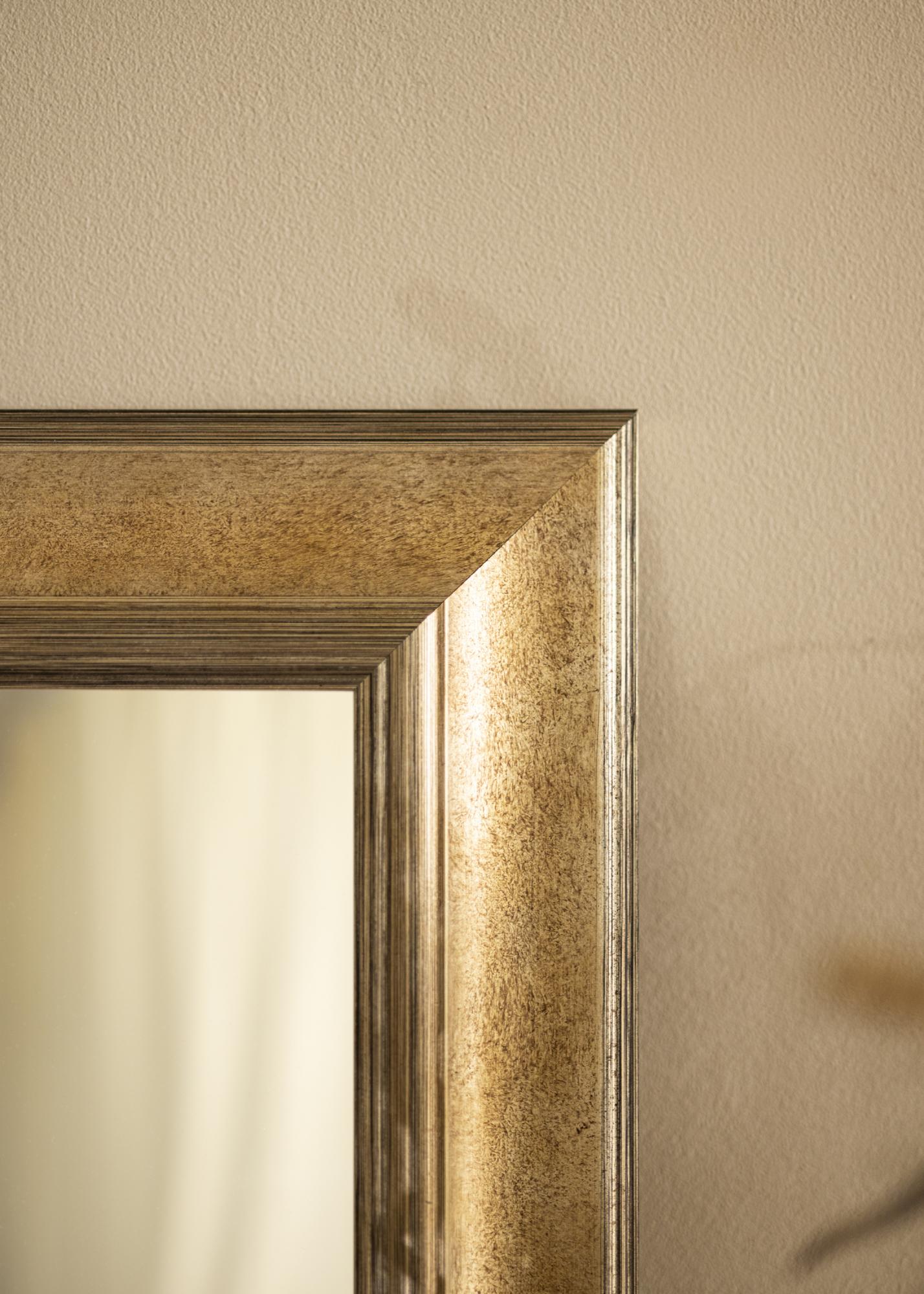 Il tono argento scuro dello specchio dona una sensazione classica e senza tempo, che lo rende facile da abbinare a diversi stili di arredamento. La superficie spazzolata ha sottili sfumature di colore che esaltano sia la profondità che la struttura, conferendo allo specchio un carattere unico. Le sottili decorazioni lineari lungo i bordi aggiungono una dimensione extra di eleganza e raffinatezza.