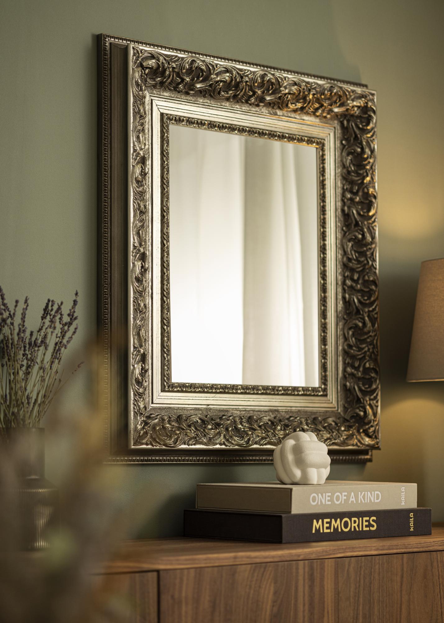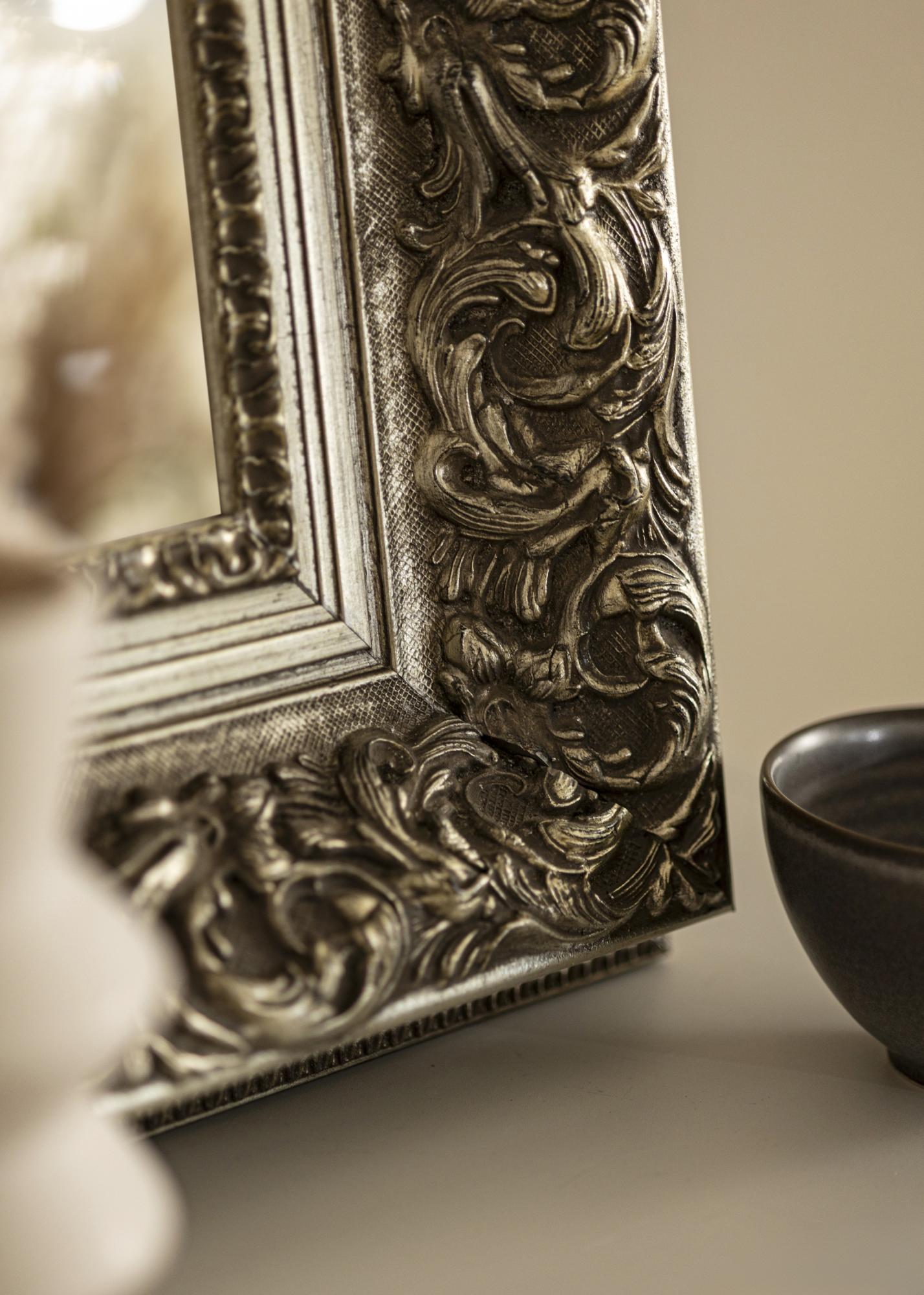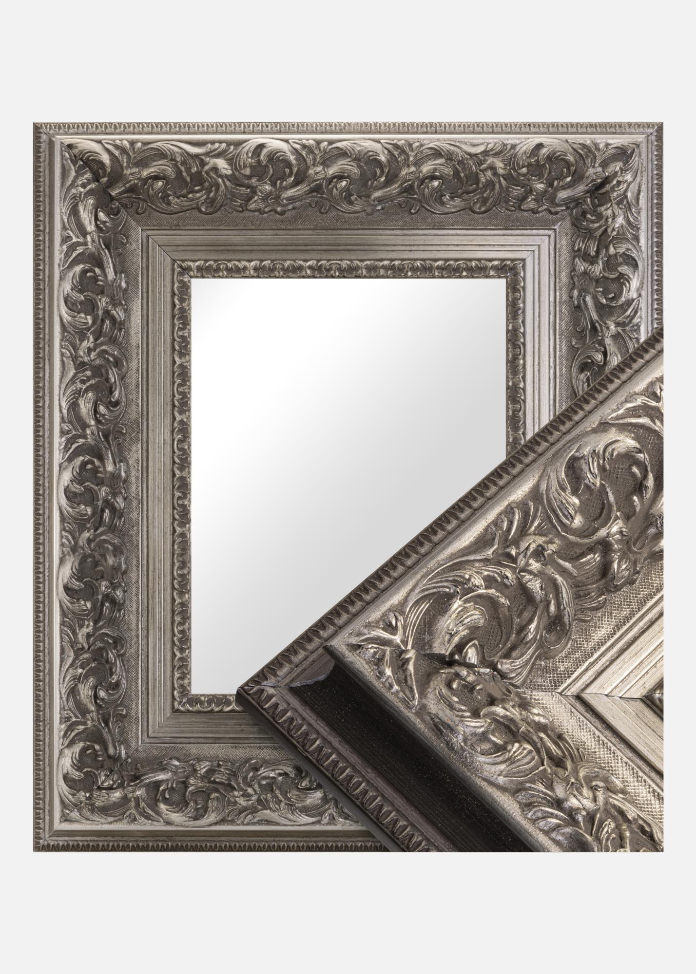 La ricchezza di dettagli intricati nella cornice dello specchio è evidenziata dall'approfondita decorazione a rilievo, dove motivi fogliari scolpiti creano un senso di eleganza e stile. La finitura della cornice combina tonalità d'argento scure e chiare, conferendo allo specchio una patina splendida e un'estetica senza tempo. Questa combinazione di colori e motivi rende lo specchio una scelta perfetta per motivi classici e incorniciature che richiedono qualcosa di speciale.