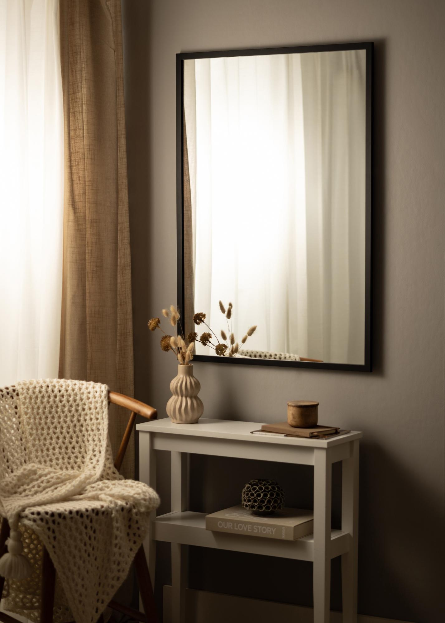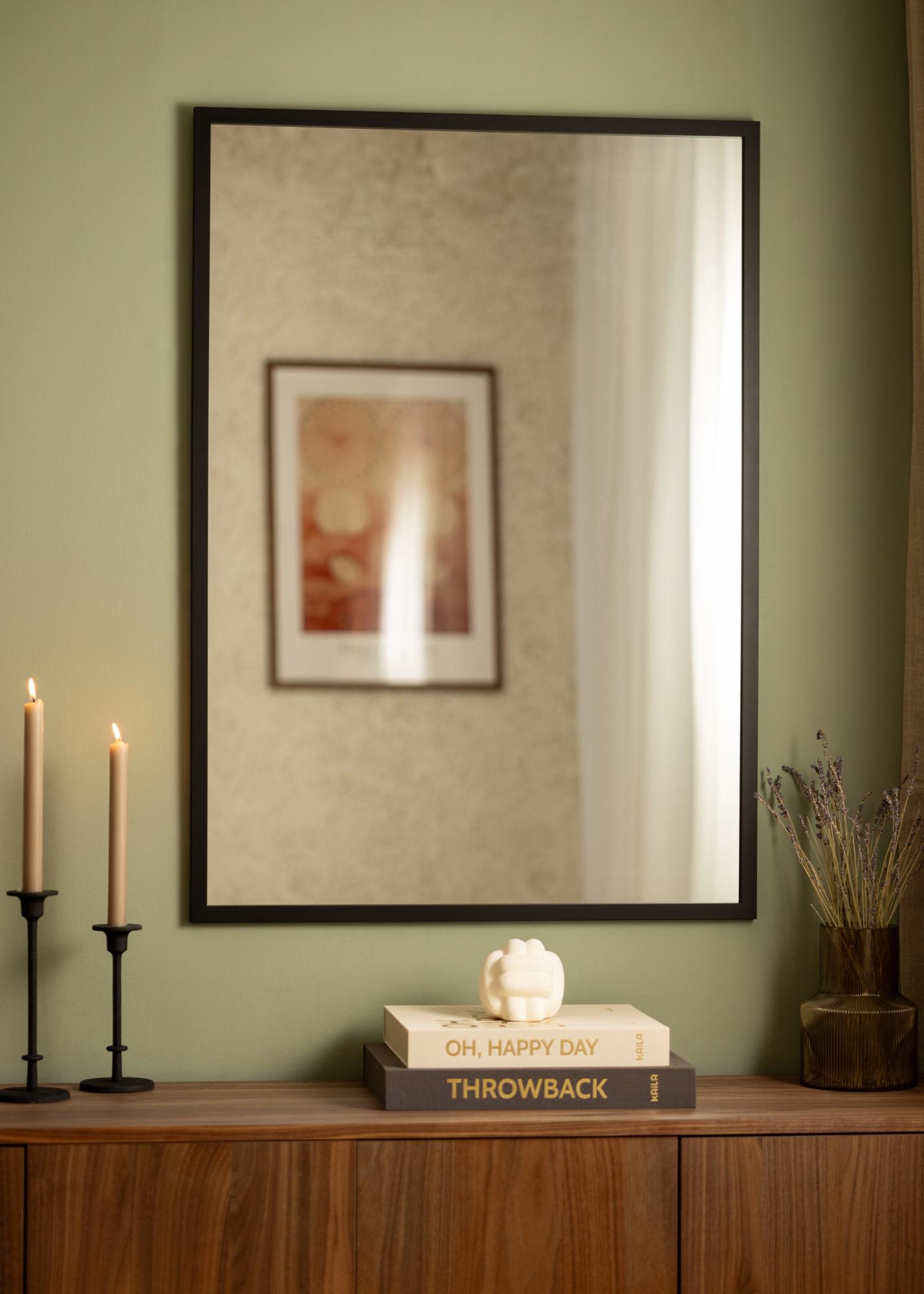 Black Wood è una scelta eccellente per coloro che cercano uno specchio da parete elegante con una semplice cornice nera. Lo specchio è realizzato in legno di ayo verniciato e dotato di vetro specchiato incolore. La cornice larga 22 mm ha un profilo quadrato tradizionale che mette in risalto la superficie dello specchio.