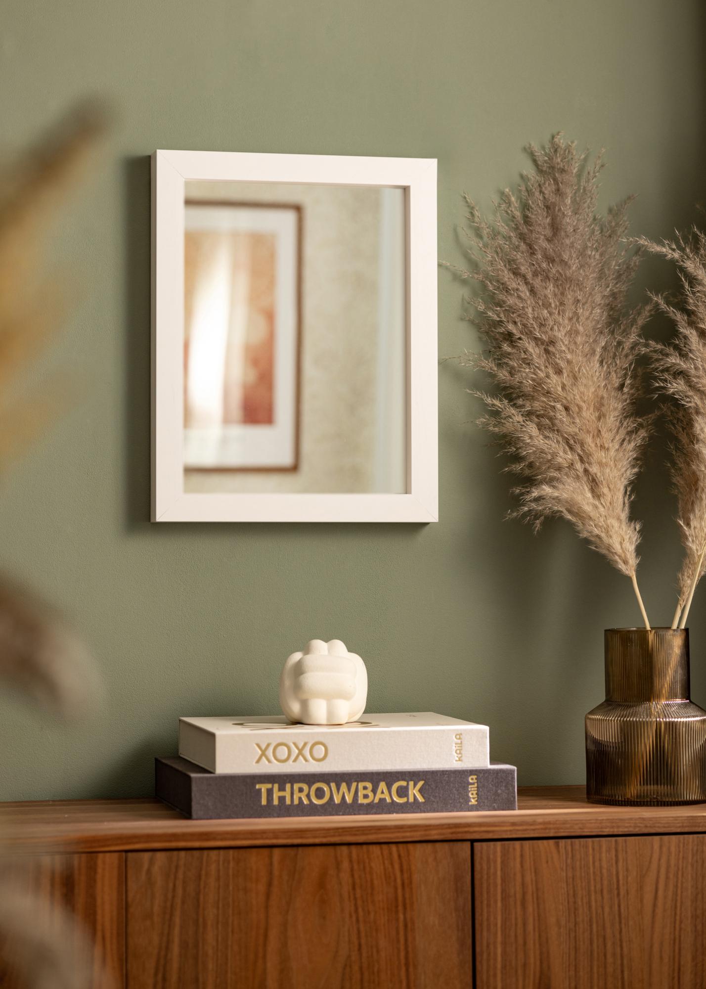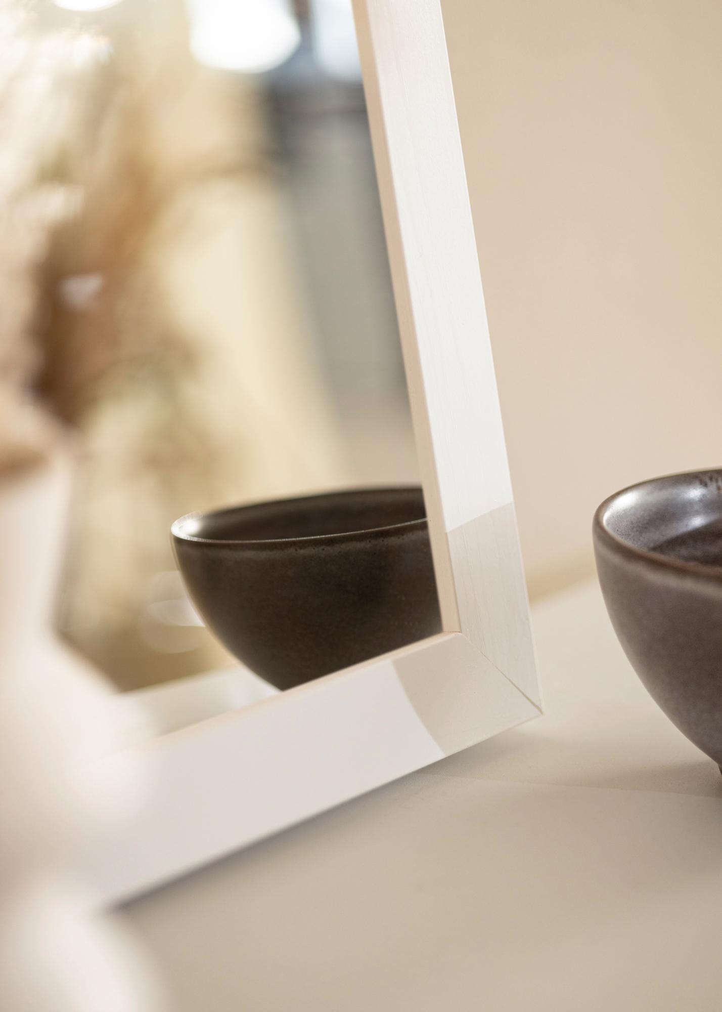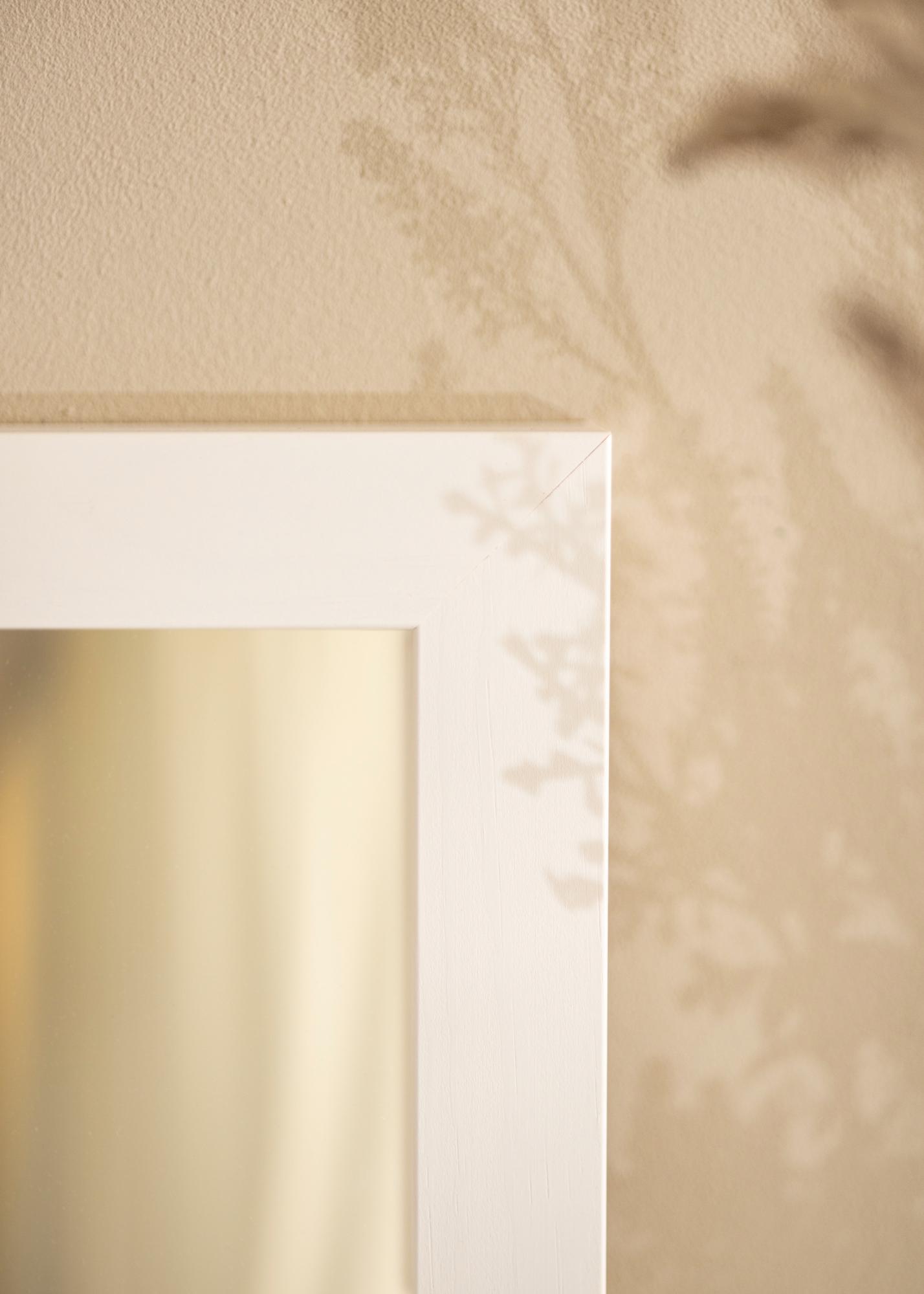 Specchio con cornice in pino realizzato in Finlandia, verniciato direttamente sul legno per una sensazione di autenticità del legno. "Boxholm Vit" ha una profondità di 43 mm che fa sì che lo specchio sporga leggermente dal muro, creando un effetto tridimensionale affascinante.