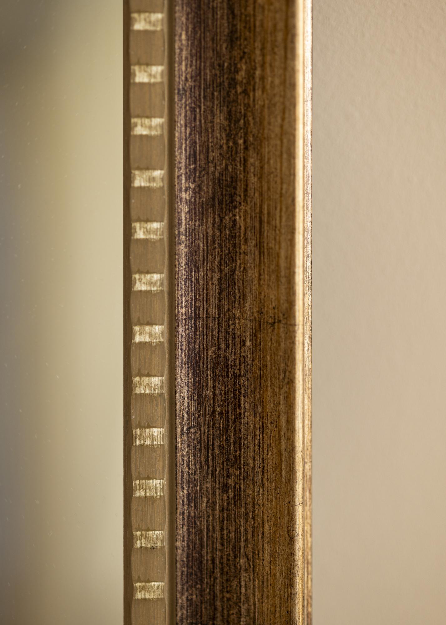 Un bordo interno decorativo è adornato con piccoli e regolari dettagli dorati. Questi creano un elegante contrasto con la tonalità legnosa più scura e aggiungono una dimensione extra di sofisticazione. Il bordo esterno ha una leggera smussatura con una discreta finitura dorata, conferendo alla cornice una sensazione lussuosa e senza tempo che non passa mai di moda.
