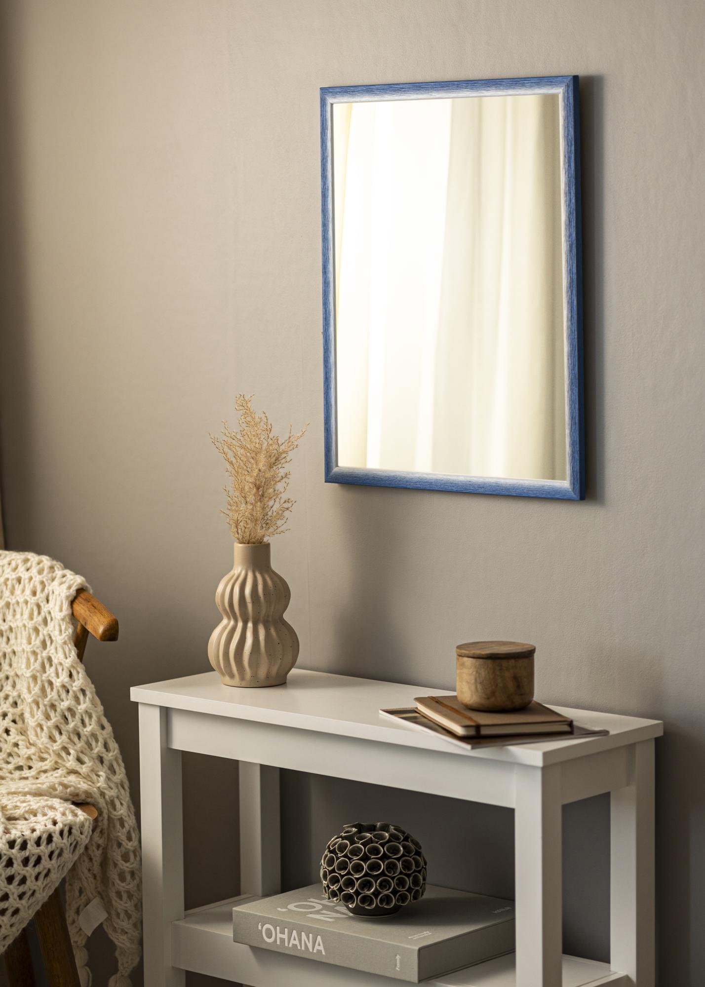 Questo specchio ha una scala cromatica vivace che varia da una tonalità chiara, quasi bianca, a un blu più profondo. Questa variazione di colore conferisce allo specchio un aspetto dinamico che può cambiare a seconda della luce nella stanza. La superficie ha una struttura in legno ben definita con venature verticali, offrendo una sensazione naturale e tattile. La transizione tra le diverse sfumature è morbida e conferisce alla cornice un'espressione unica e dipinta a mano.