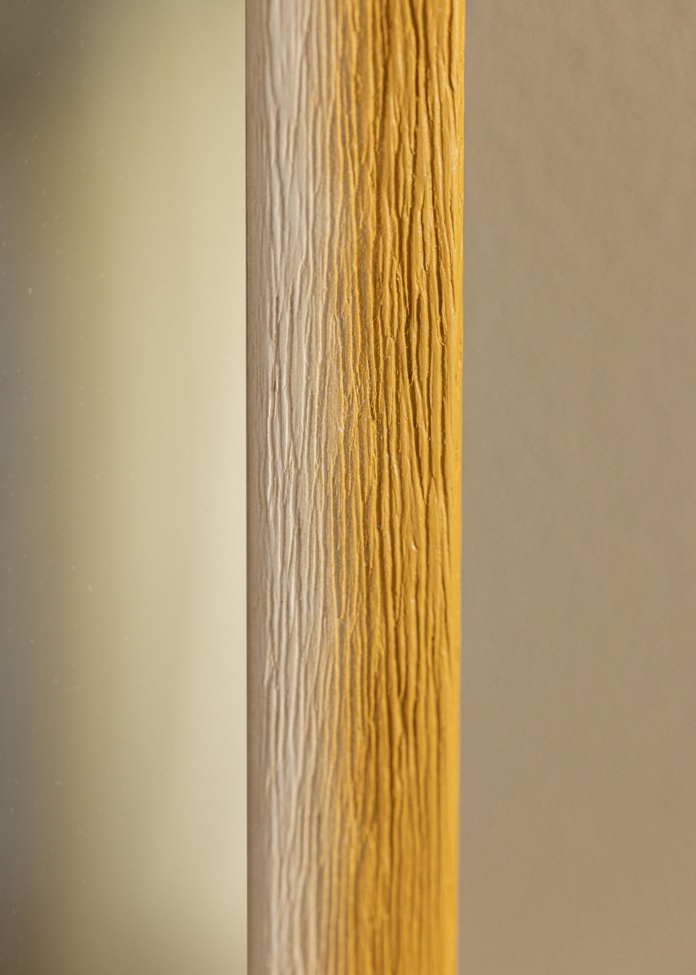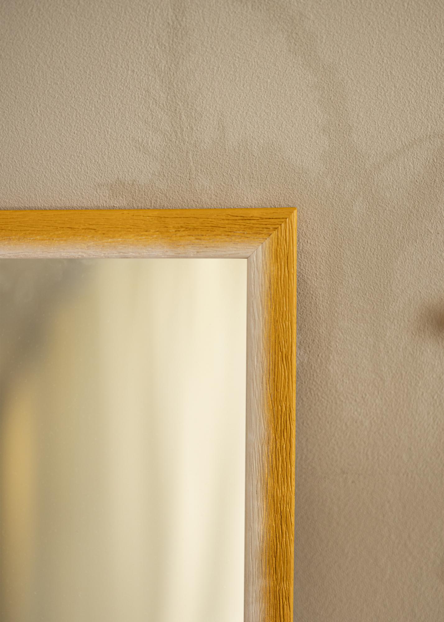 Questo specchio si distingue per la sua transizione cromatica armoniosa da un tono bianco naturale chiaro a una calda sfumatura giallo ocra. Questa transizione sottile crea un'espressione dipinta delicata che conferisce alla stanza una profondità vivace. La superficie della cornice è caratterizzata da una chiara struttura legnosa con venature profonde, il che conferisce una sensazione tattile e naturale. Questo fa sì che lo specchio non sia solo funzionale ma anche un dettaglio decorativo nella tua casa.