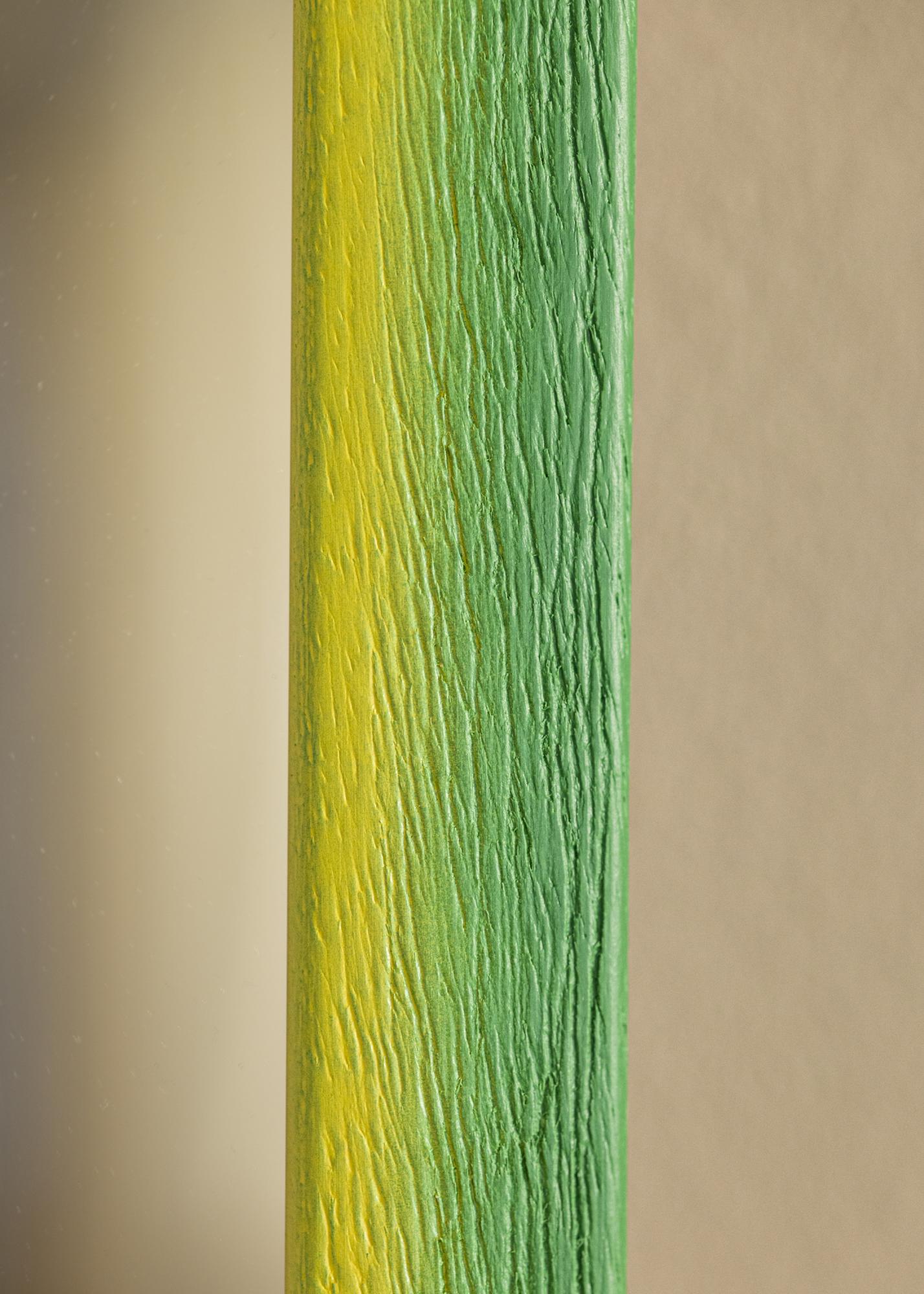 Questo specchio si distingue per la sua vivace gamma di colori, in cui una morbida transizione dal giallo sole al verde lussureggiante crea un'atmosfera armoniosa e invitante. La superficie è caratterizzata da una distintiva struttura in legno con venature profonde, che conferisce allo specchio una sensazione tattile moderna e rustica. Le tonalità si fondono naturalmente creando un effetto dipinto a mano con un'espressione organica, rendendo ogni specchio unico nel suo genere.