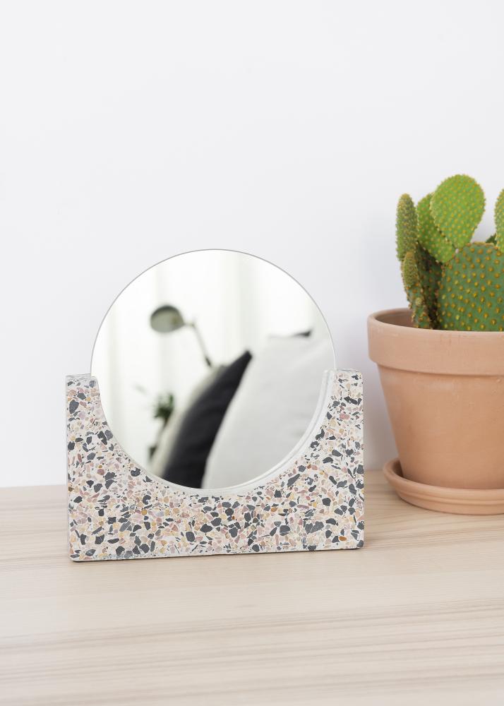 Questo specchio rotondo da tavolo è quasi un'opera d'arte! Un'elegante e robusta base in bellissimo Terrazzo bianco (pietra sintetica) rende questo specchio molto più di un semplice oggetto funzionale. È un dettaglio d'arredo di buon gusto che aggiunge un design moderno a qualsiasi stanza tu scelga di posizionarlo.