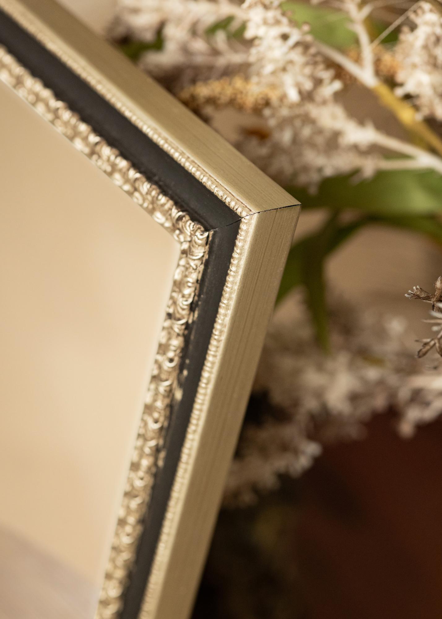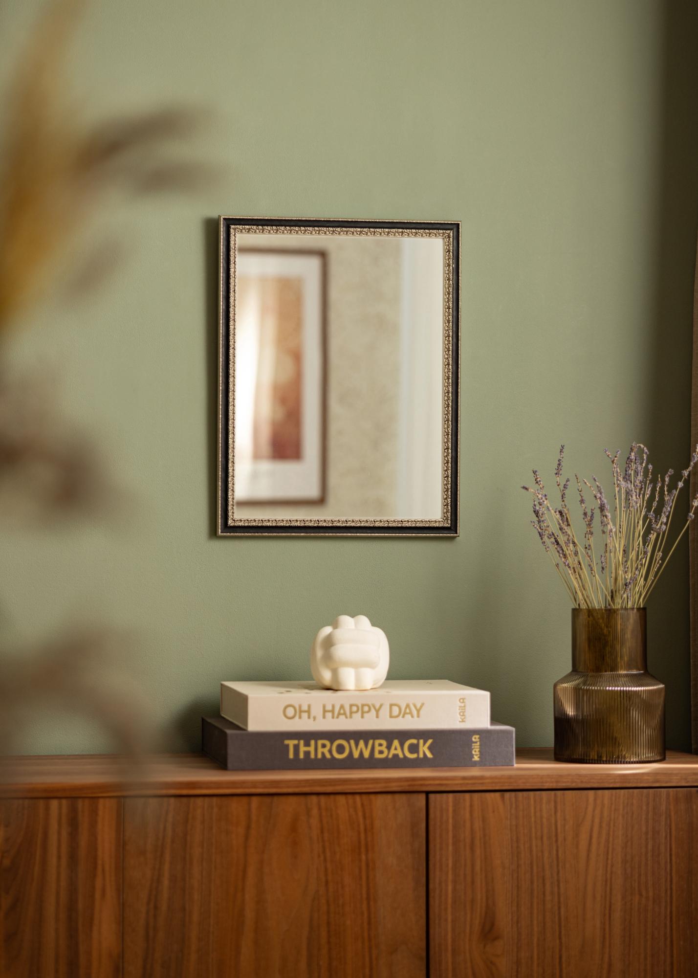 La cornice è realizzata in legno e ha una finitura in oro antico con ornamenti decorativi che conferiscono allo specchio una sensazione classica e senza tempo. I dettagli decorati sono ulteriormente evidenziati dal bordo nero, creando un equilibrio armonioso tra l'antico e il moderno.