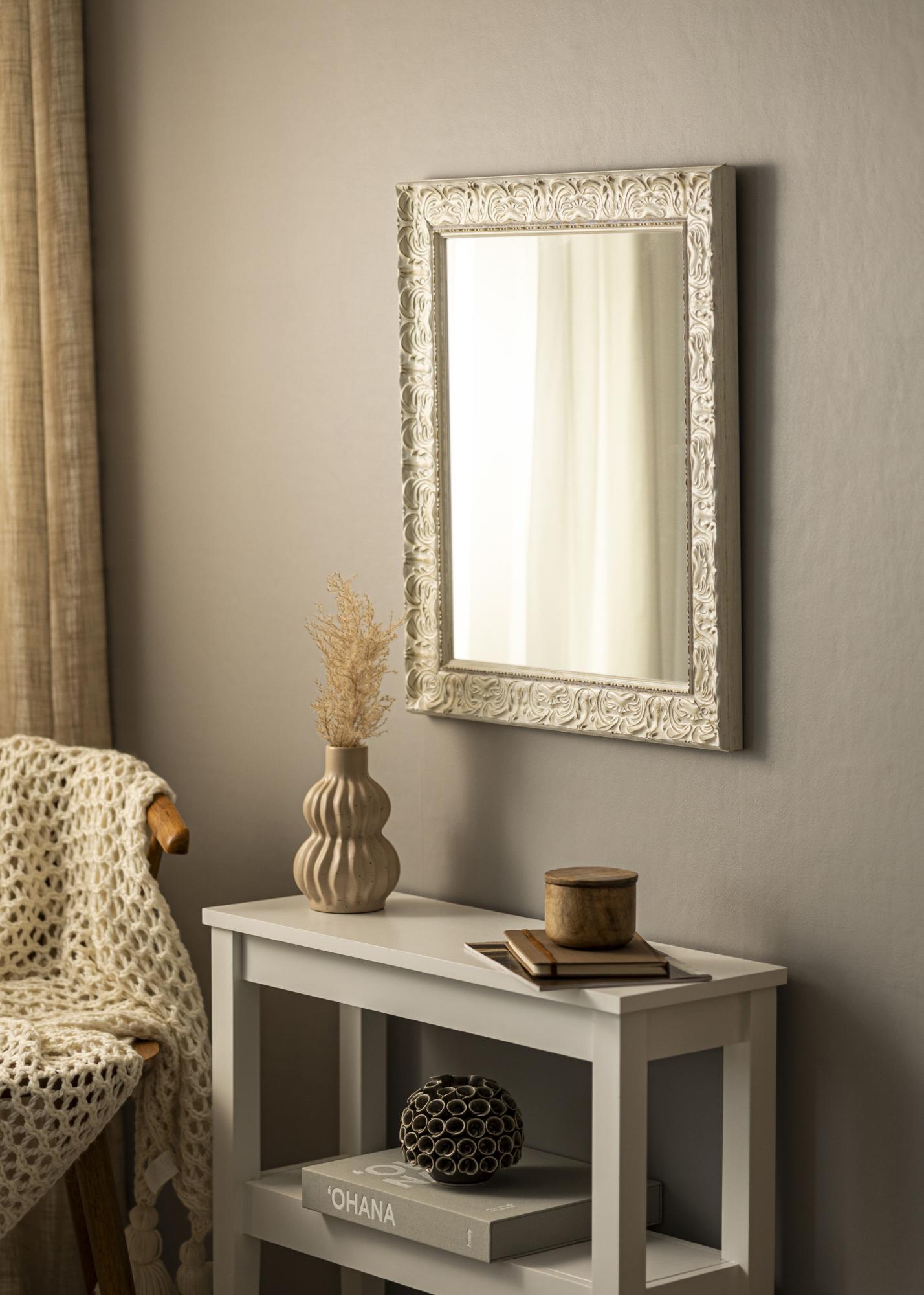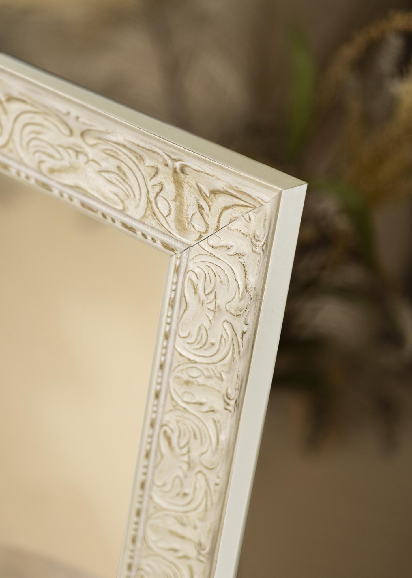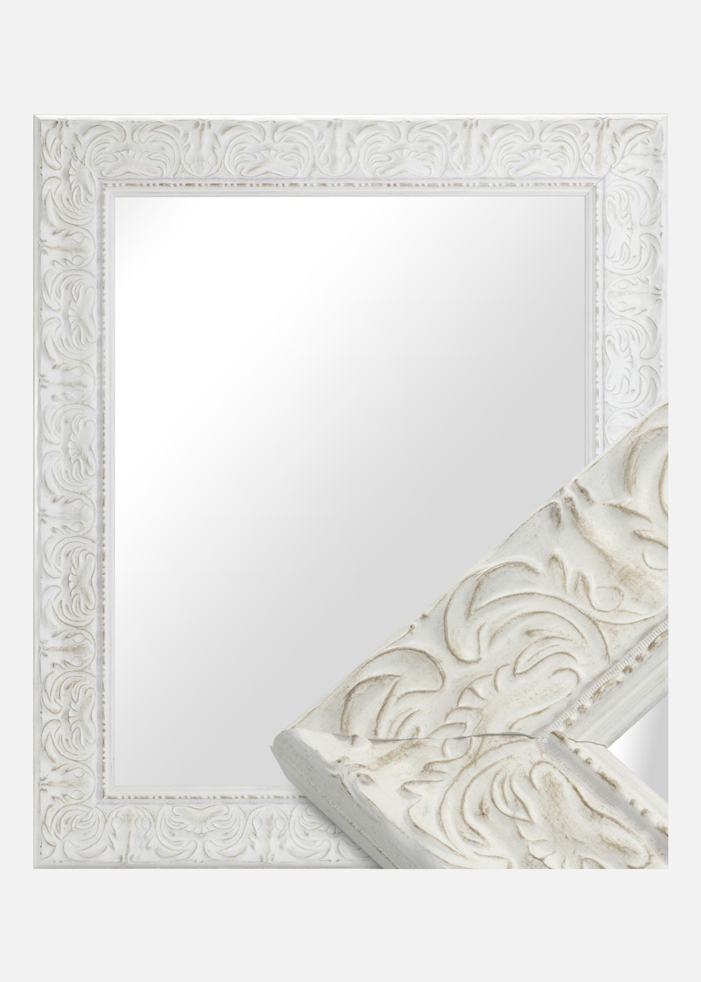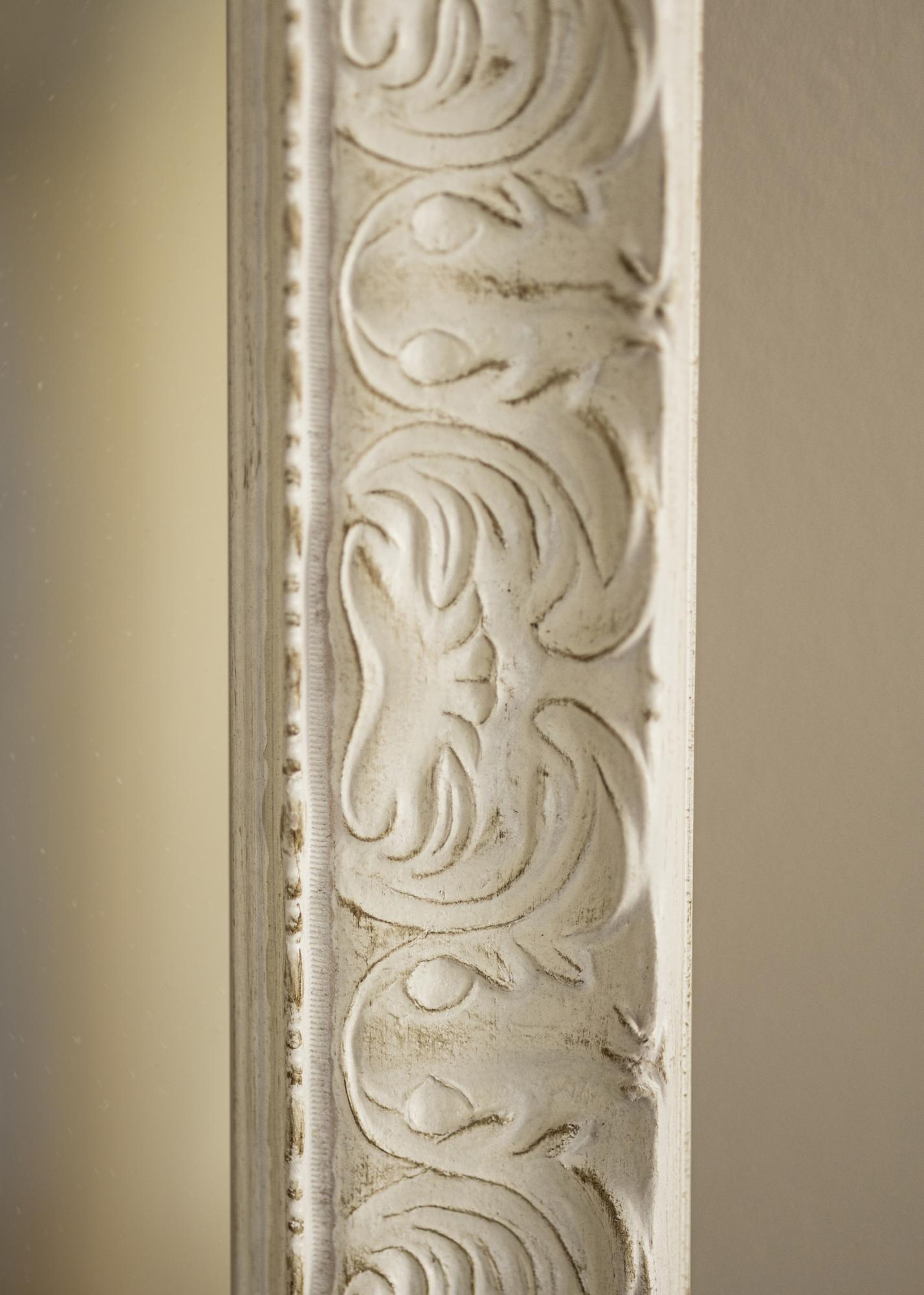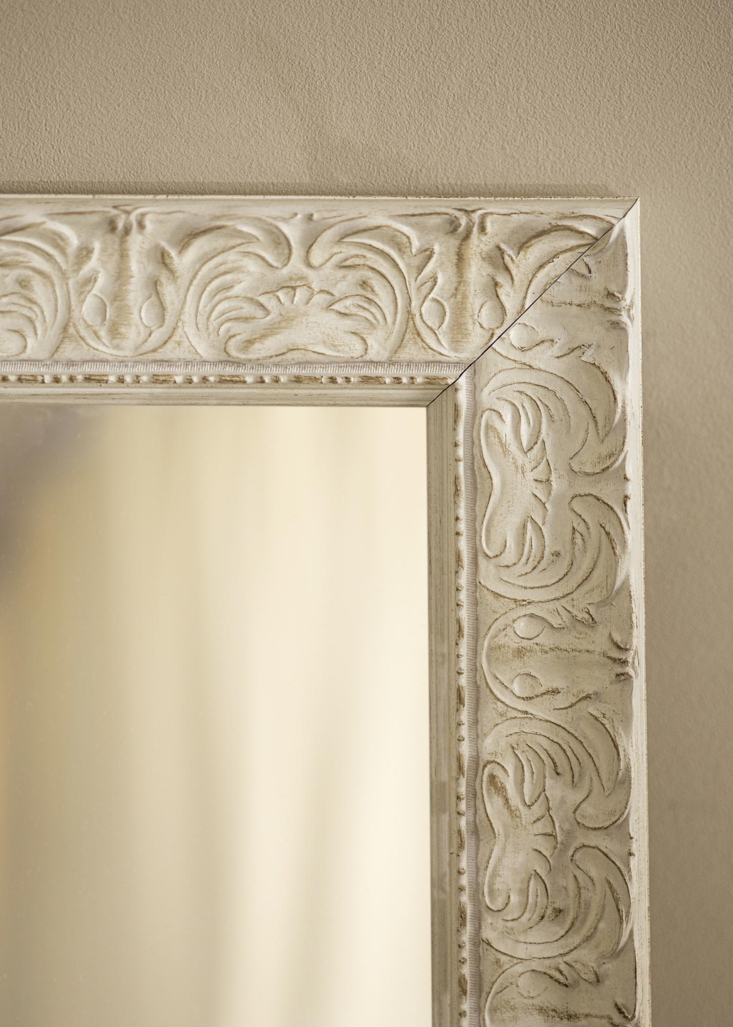 La finitura bianco antico dello specchio con rilievi decorativi e superficie leggermente consumata gli conferisce un carattere unico. I dettagli decorati esaltano la sua espressione classica e lo rendono un elemento di spicco nella stanza. Indipendentemente dal fatto che tu abbia un arredamento moderno o tradizionale, questo specchio si integrerà aggiungendo al contempo qualcosa di speciale.