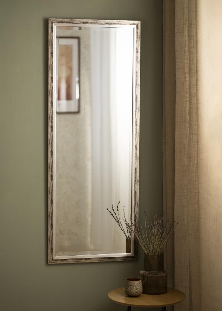Rendi la parete interessante con questo bello specchio! Lo specchio ha una cornice argento con una ampia parte "consumata" all'esterno e una parte argento più vicina al vetro. Il vetro è elegantemente e l'insieme crea profondità sulla tua parete. Il design si adatta bene sia in una casa di campagna moderna che in un ambiente più urbano.